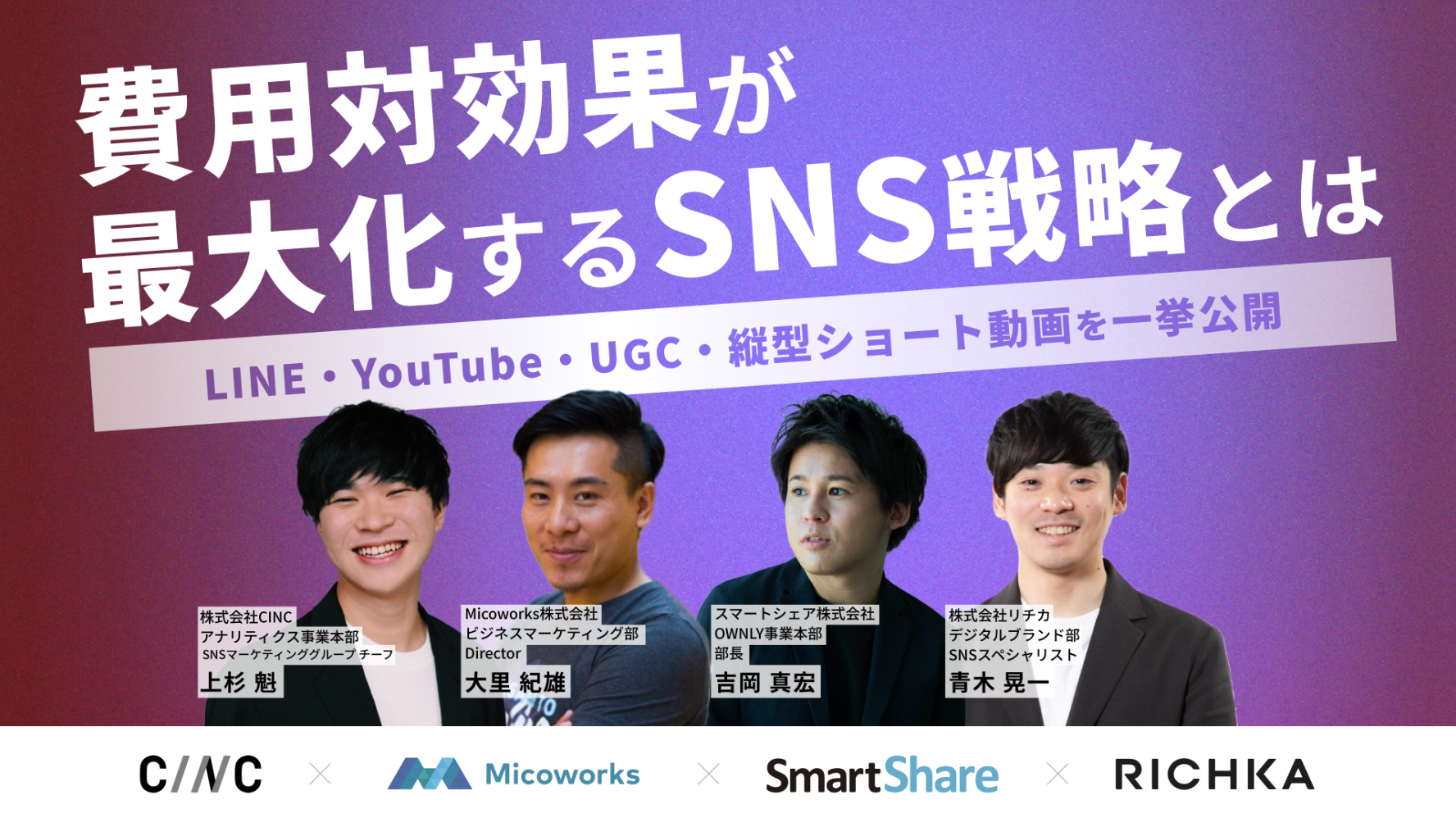 今回のセミナーでは、費用対効果が最大化するSNS戦略とはをテーマに、これからのSNS運用のさらに効率化する方法をSNS支援のプロフェッショナルである4社が集まり、一挙公開いたします。