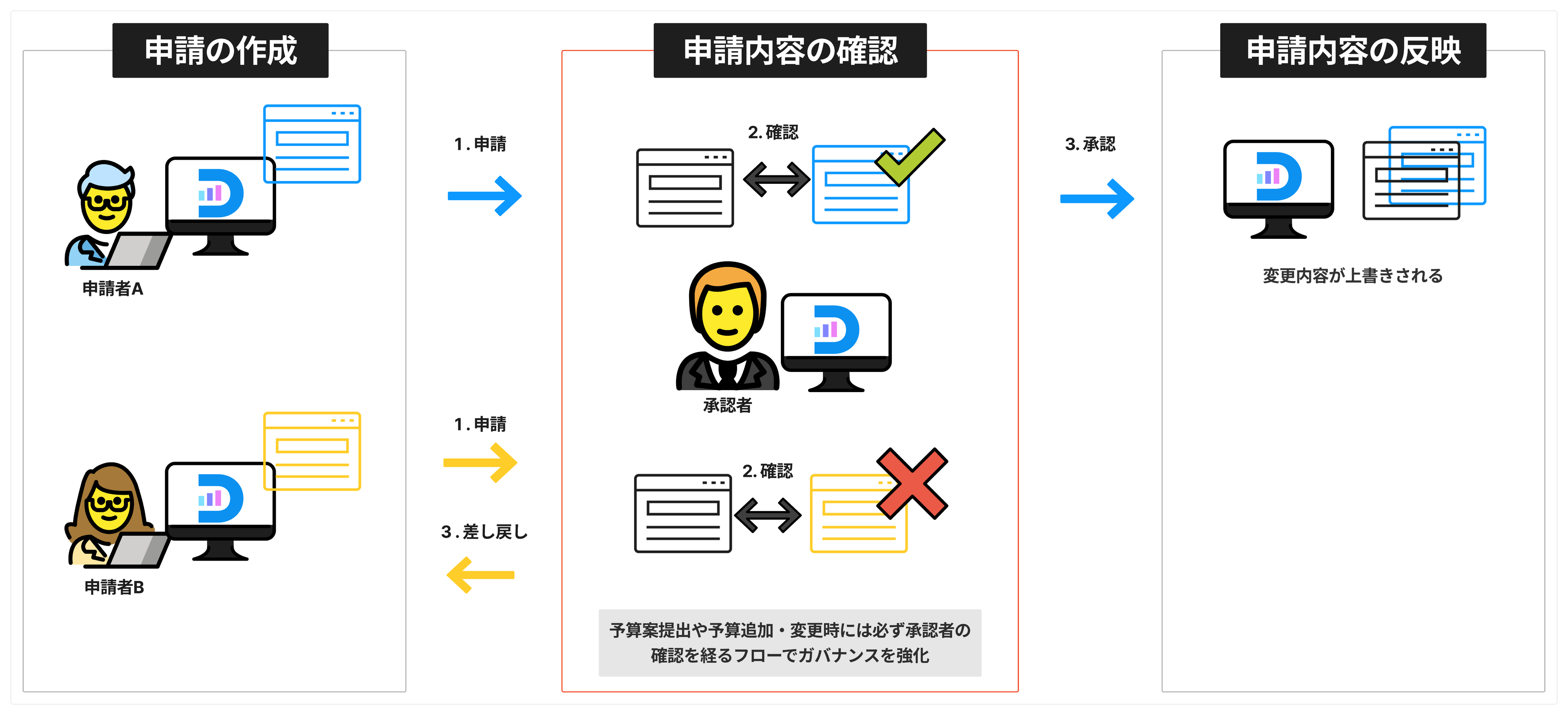 申請・承認機能とは、予算案提出や追加予算・予算額変更等の申請から承認までを「DIGGLE」上で行える機能です。承認者から申請者に対する予算・見込の記入依頼を行うことも可能です。
