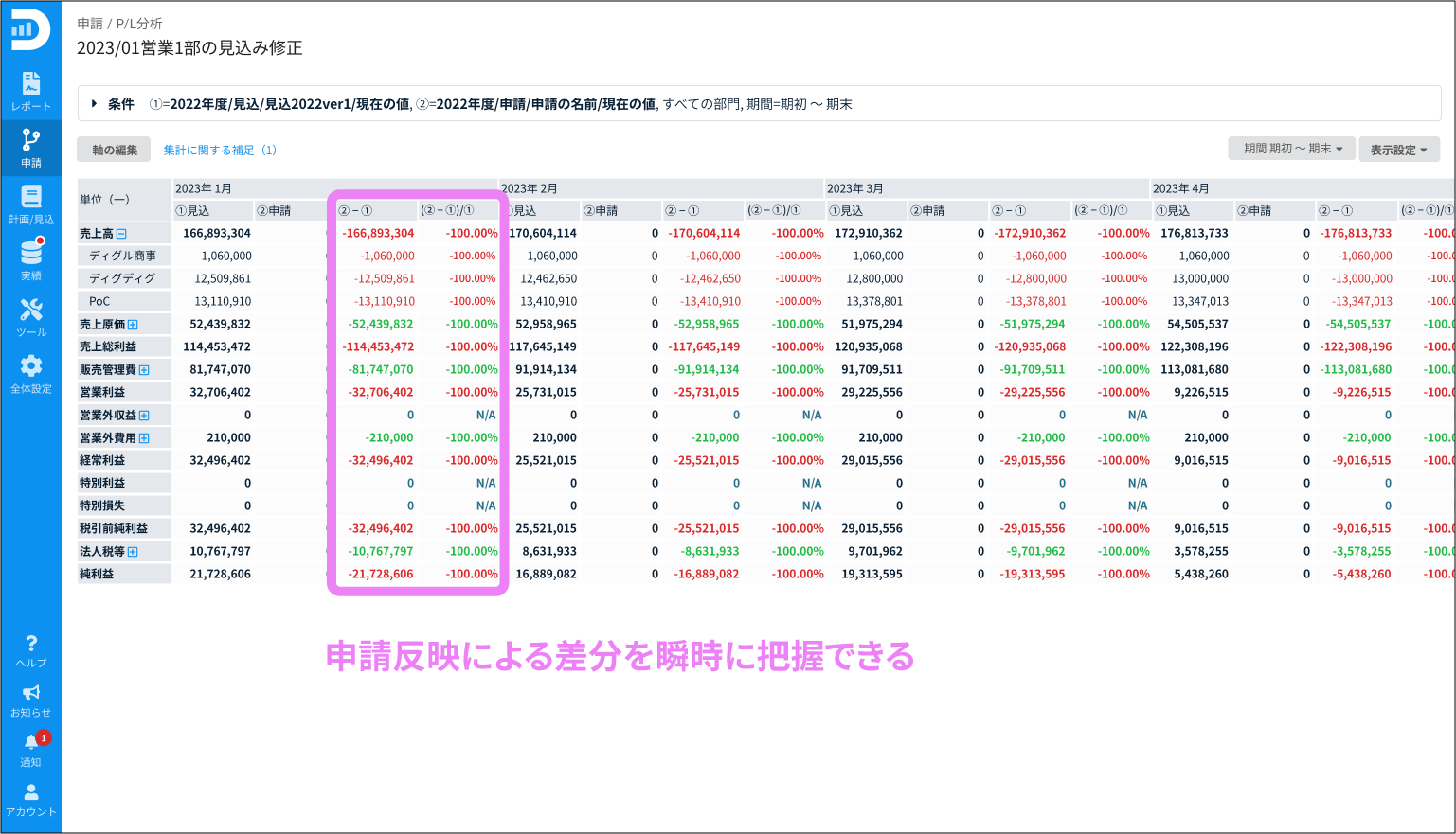 個別の申請においては、PLへの影響や差分を瞬時に把握した上で申請内容の是非を判断できます。業績目標や経営方針との整合性を踏まえた上での、スピーディな予算の振り分けや新規の投資といった経営判断を実現します。