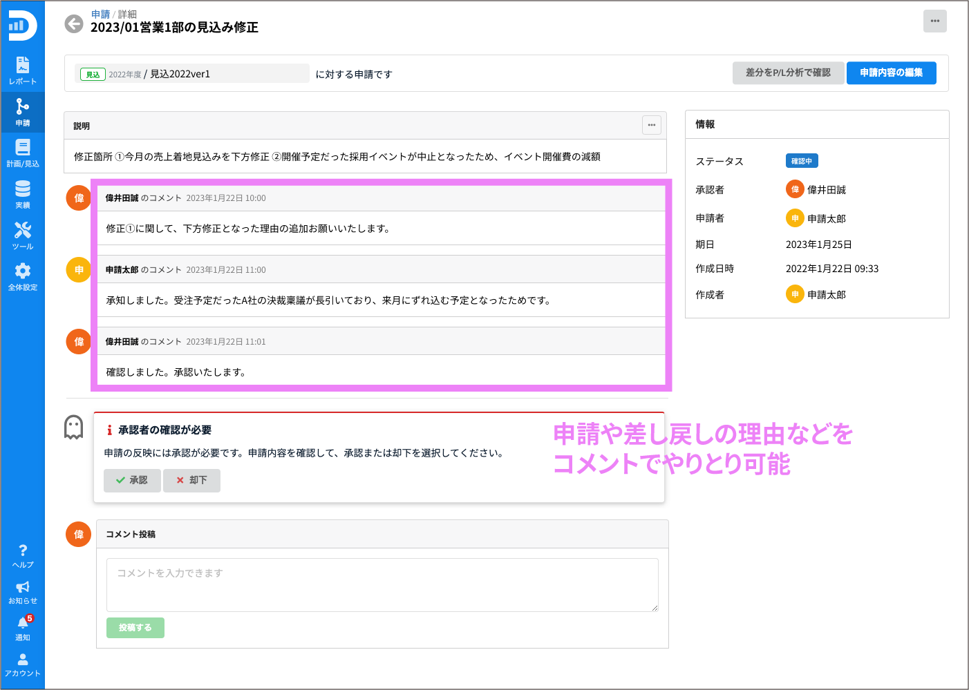 申請・承認機能の提供により、承認を経ていない変更の防止が可能となり、ガバナンス強化を実現できます。また、承認者が予算と見込の変更内容の損益計算書(PL)への影響を一覧で確認できるため、スピーディかつ最適な予算の再配分や投資判断も可能となります。さらに、一連のやりとりがDIGGLE上で完結し、変更履歴も残るため、事業部・経営管理部間のコミュニケーションのシームレス化が可能となります。