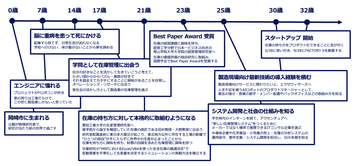 幼少期、製造業の在庫管理に興味を持ち、在庫戦略を考えた学生時代の研究やこれまでのキャリアを築いた経緯、FACTORY Xを創業するまでの内容となっています。是非ご覧ください。
