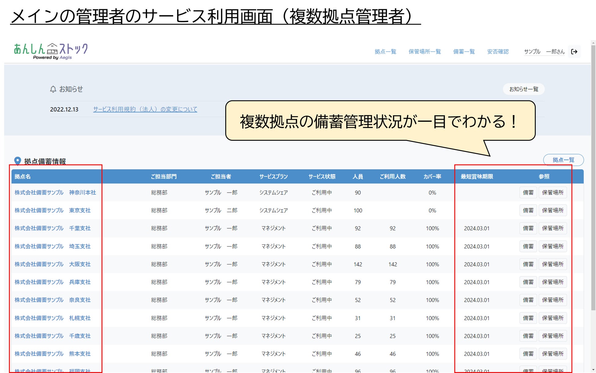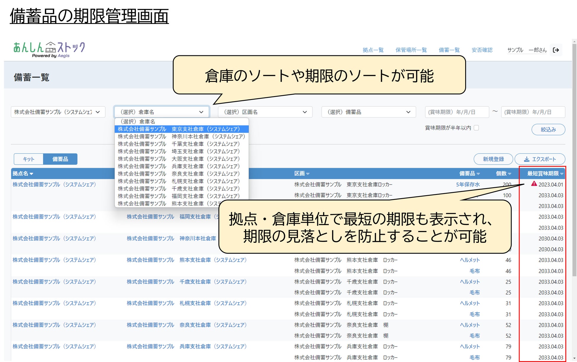1)複数拠点、複数倉庫の備蓄品の数量、期限などの情報を一元的に管理することができます