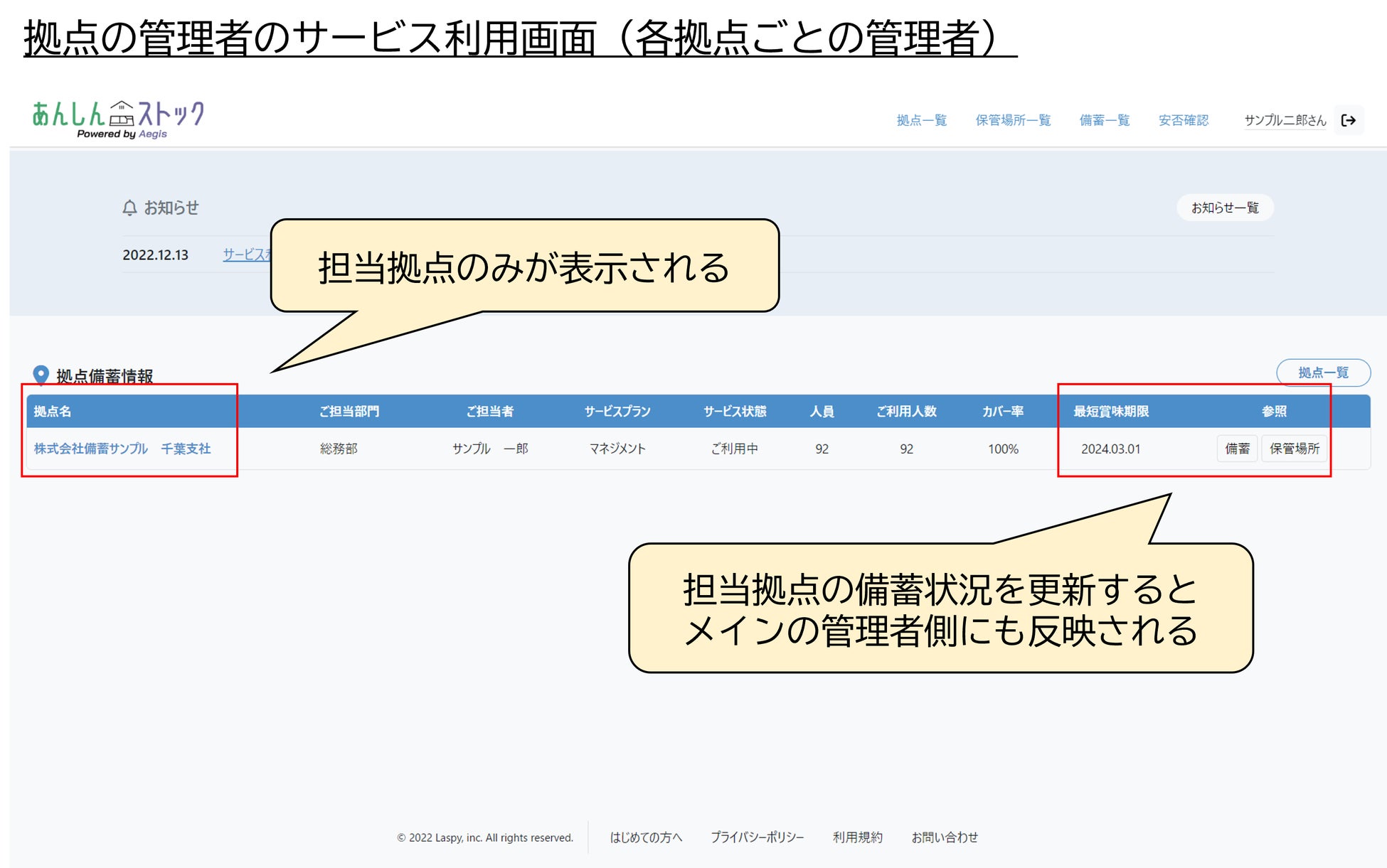 全国に複数の拠点をお持ちの場合には、メインの管理者とは別に拠点ごとの管理者を設定することが可能です。各拠点の管理者が情報を更新すれば、メインの管理者は社内の備蓄状況をすぐに把握することができます。