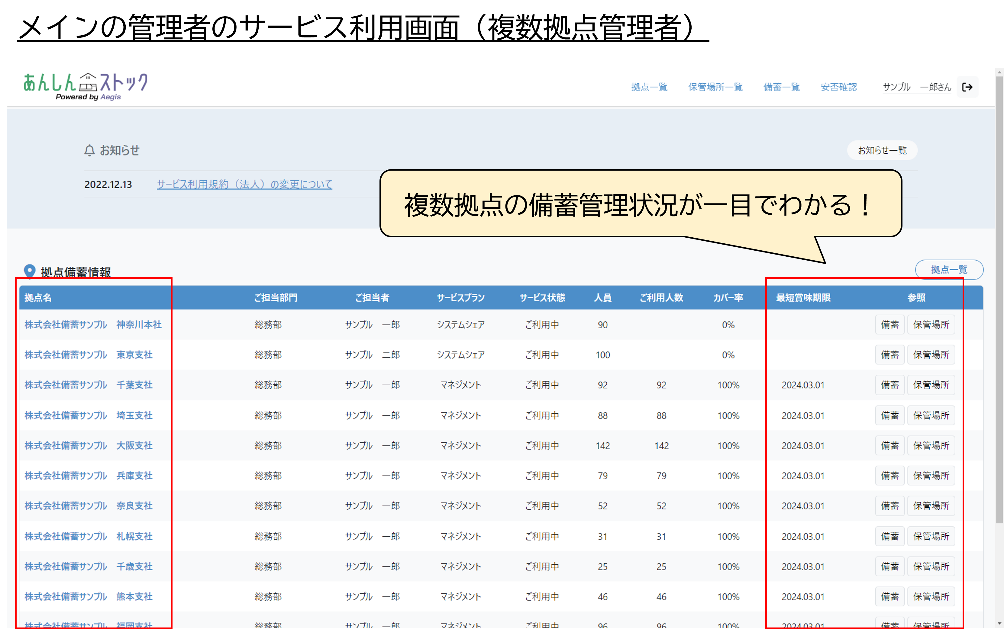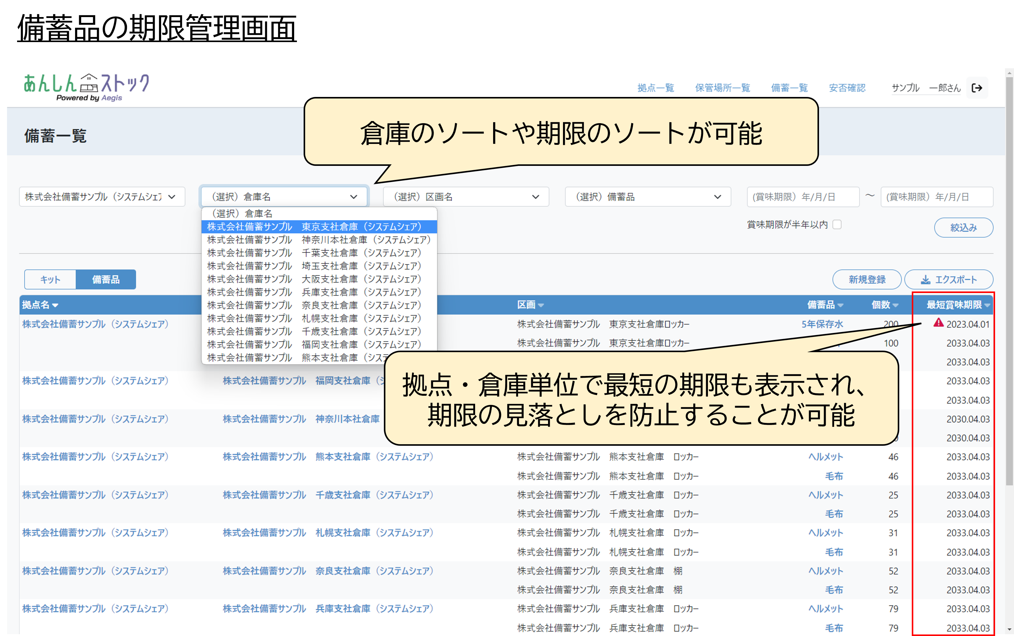 1)複数拠点、複数倉庫の備蓄品の数量、期限などの情報を一元的に管理することができます