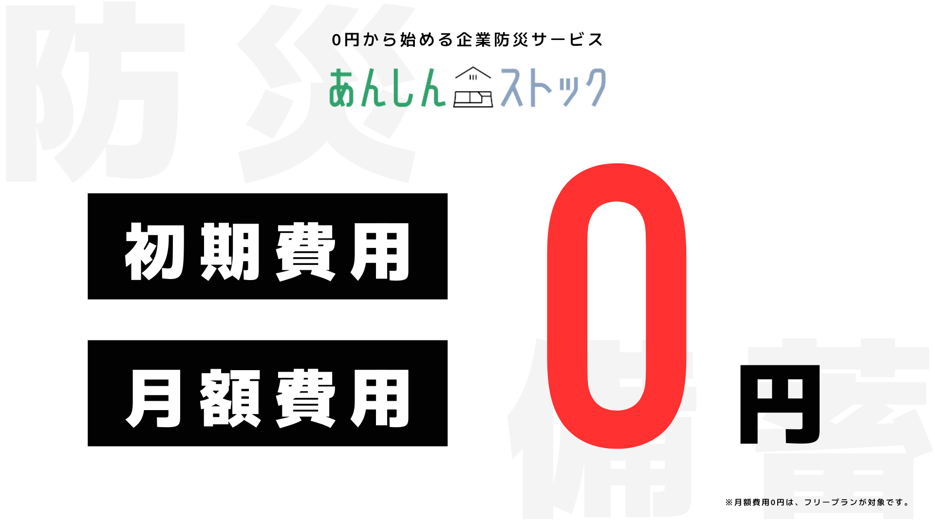 「あんしんストック フリープラン」は、初期費用0円、月額費用0円で、企業の防災備蓄管理をスマートにすることができるクラウドサービスです。