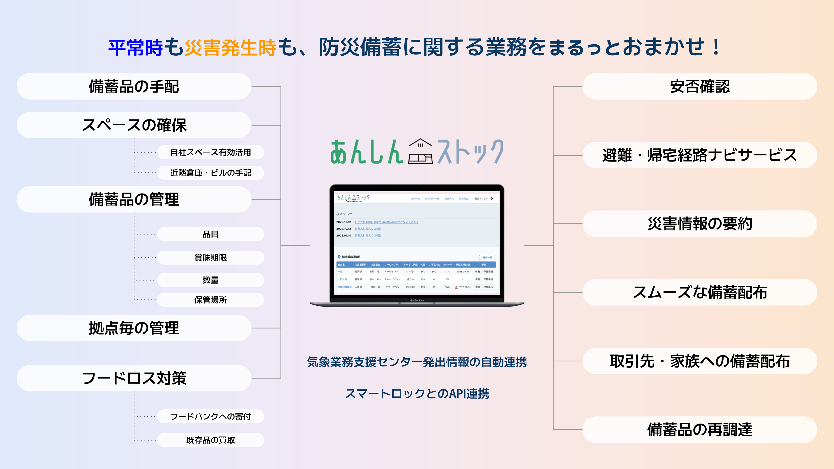 大規模災害の発生や地震、水害などの頻発により、防災・BCP(事業継続計画)の重要性はますます高まっています。これまでにLaspyは、新しい形のサブスク型防災備蓄サービス「あんしんストック」を通じて、①置く場所がない、②管理が面倒、③気づいたら賞味期限が切れている、といった備蓄のお悩みを解決してまいりました。