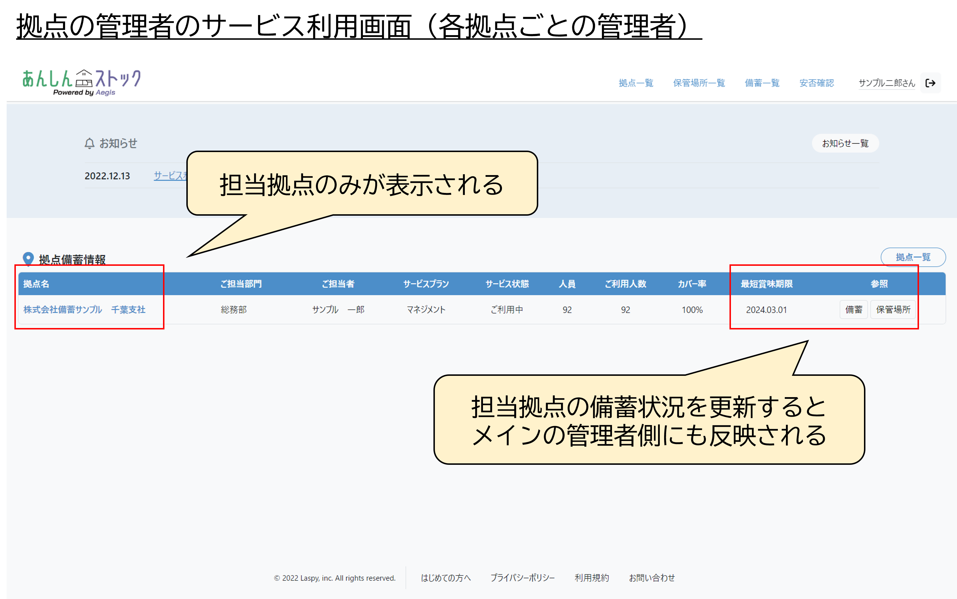 全国に複数の拠点をお持ちの場合には、メインの管理者とは別に拠点ごとの管理者を設定することが可能です。各拠点の管理者が情報を更新すれば、メインの管理者は社内の備蓄状況をすぐに把握することができます。