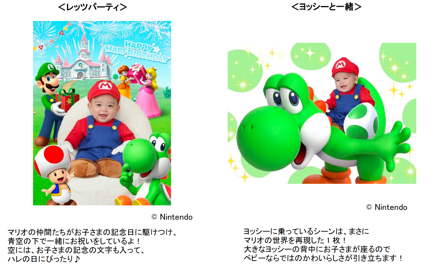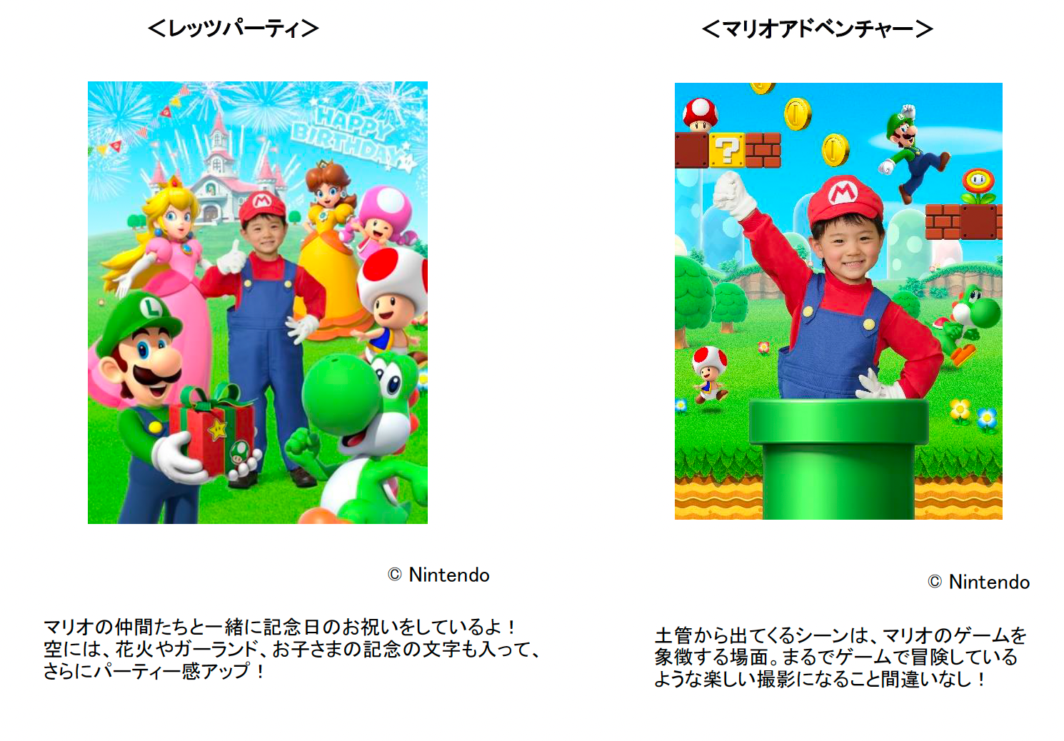 「スーパーマリオ」の初登場に際して、オーバーオール、帽子、グローブ、ブーツが揃った3サイズの展開で、お子さまがマリオになりきり撮影することができる新衣装が登場。「スーパーマリオ」を象徴する土管から出てくるシーンや、まるでヨッシーの背中に乗っているかのような撮影など赤ちゃんから小学校低学年くらいのお子さままで楽しめる撮影です。また、お子さまの記念を花火で文字入れすることができる専用絵柄もあり、お子さまのお誕生日や七五三などハレの日や大切な記念撮影にぴったりです。マリオの仲間たちと一緒に撮影し「スーパーマリオ」の世界観を楽しめるスタジオアリスだけのフォトメニューです。ぜひこの機会に撮影いただき、「スーパーマリオ」の世界観を存分にお楽しみください。