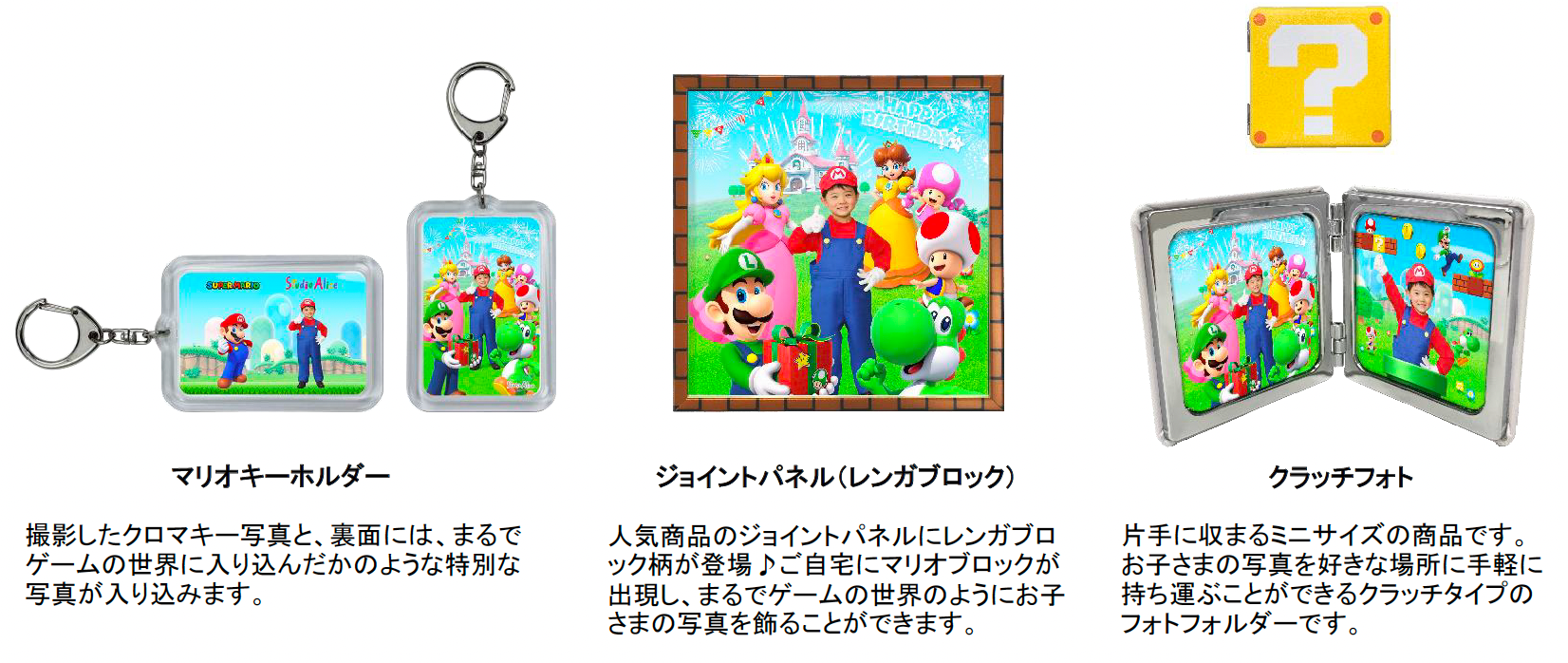 マリオ衣装、撮影絵柄導入に伴い、「スーパーマリオ」オリジナルフォトグッズを販売いたします。写真を入れることができる全3種類のグッズを展開し、お子さまの大切な記念写真を持ち歩いたり、ご自宅に飾ることができるため、「スーパーマリオ」の世界観をいつでもどこでも楽しめます。