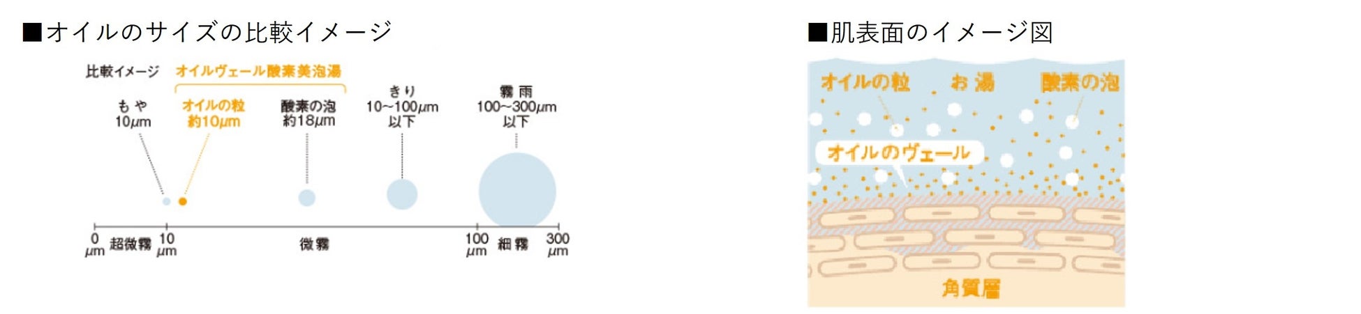 「オイルヴェール酸素美泡湯」は、「酸素美泡湯」の機能をさらに進化させたものです。パナソニック独自技術により専用の「美泡湯オイル」を約10 μmまで微粒化。本オイルと酸素を含んだ約18 μmの微細気泡を併せてお湯の中に均一に分散させます。この微粒化したオイルが肌にヴェールのように密着することで、肌の水分の蒸発を防ぎ、湯上り後に乾燥しがちなお肌をしっとり、うるおいのある肌に整えます。「美泡湯オイル」の1回の使用量は浴槽一杯のお湯につき、2 ml(小さじ半分弱)と​少量で、べたつきなく全身がしっとりうるおいます。