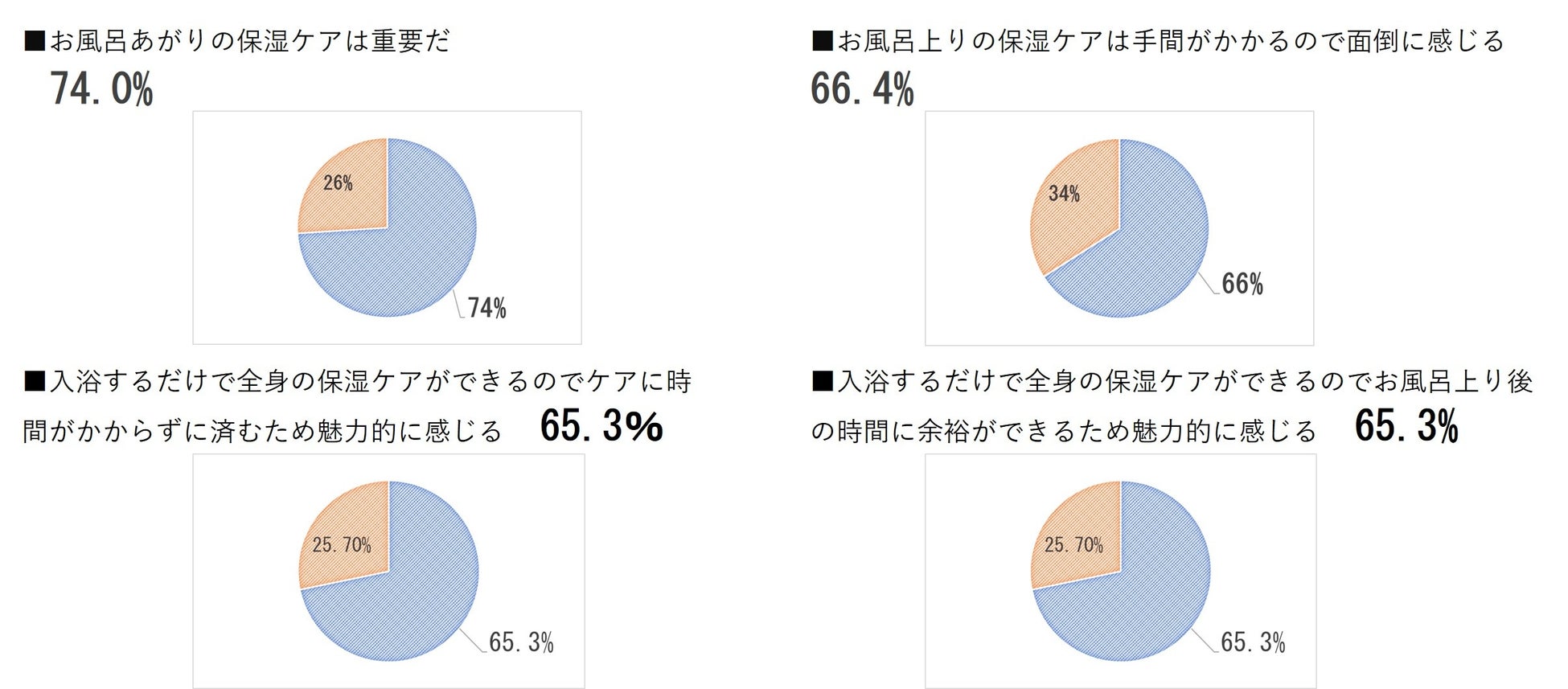 また、「入浴するだけで保湿ケアができること」は、ケアに時間をかけずに済む、また湯上り後の時間に余裕が生まれることにメリットを感じていただいていることが分かりました。