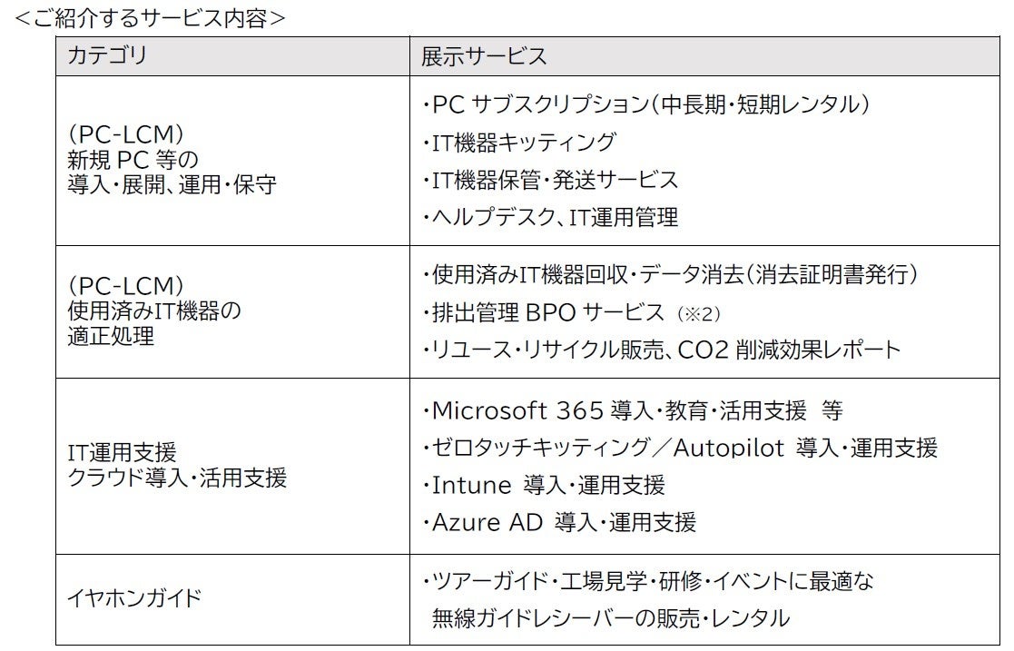 今回の展示会におきましては、「情報システム部門の業務負荷軽減」をテーマとして、「PCレンタル(短期・長期)」「PC-LCM (※1)」「Windows 365 導入・活用支援」「IT機器データ消去・排出管理BPO」等の当社サービスをご紹介いたします。