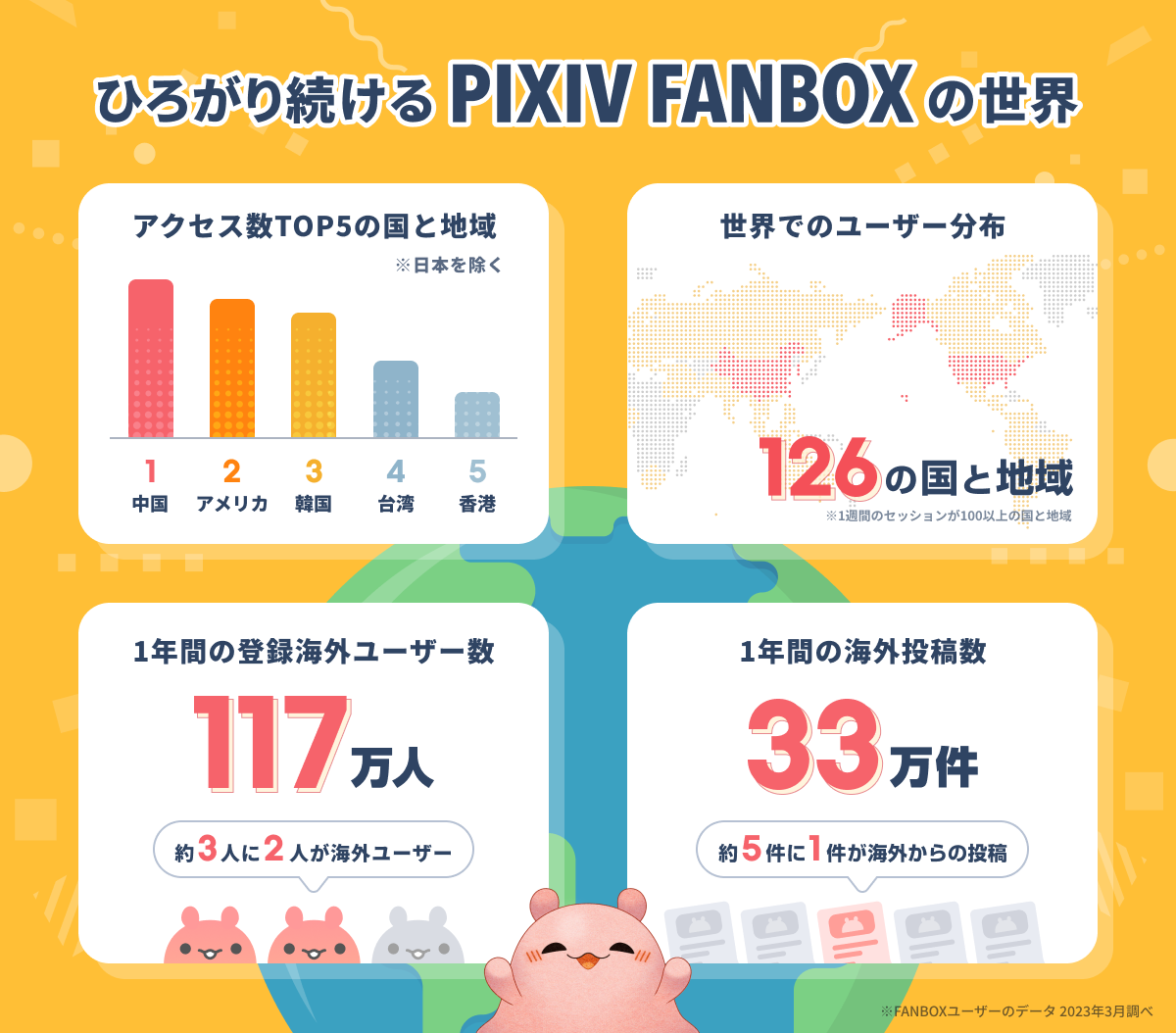 日本国外からのアクセスも年々増加しており、pixivFANBOXの海外ユーザーは全体の40%以上を占めています。昨年4月に公開したデータでは海外ユーザーは全体の30%となっており、それと比較すると、FANBOX全体の利用者の中でも、とくに国外からの利用がこの1年で伸長しています。