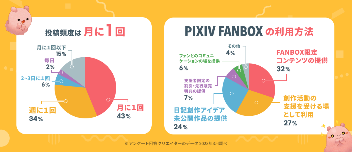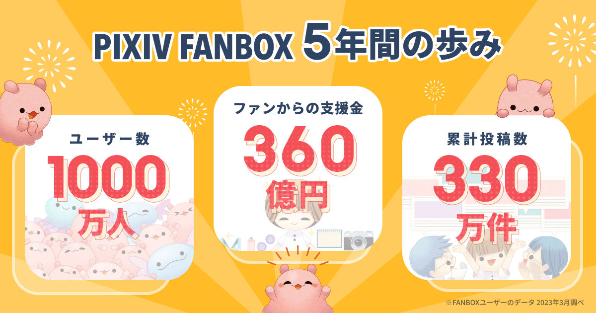 pixivFANBOXとは、クリエイターの継続的な創作活動を応援するファンコミュニティです。クリエイターは、ファンから毎月支援を得ることができ、創作の裏話を支援者だけに公開したり、ファンとのコミュニケーションを楽しむことができます。2023年4月26日(水)に5周年を迎えました。