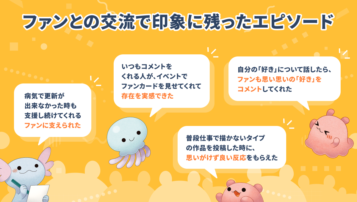 ファンとの交流で印象に残ったエピソードとしては、「普段仕事で描かないタイプの作品を投稿した時に、思いがけず良い反応をもらえた」「自分の『好き』について話したら、ファンも思い思いの『好き』をコメントしてくれた」という声がありました。金銭的な支援だけではなく、ファンとの交流がクリエイターのモチベーションとなり、創作活動を支えています。