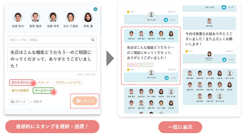 ・「成果の可視化」:スタンプ化された感謝のメッセージを分析することで、企業理念に基づい従業員の成果や貢献が可視化されます。