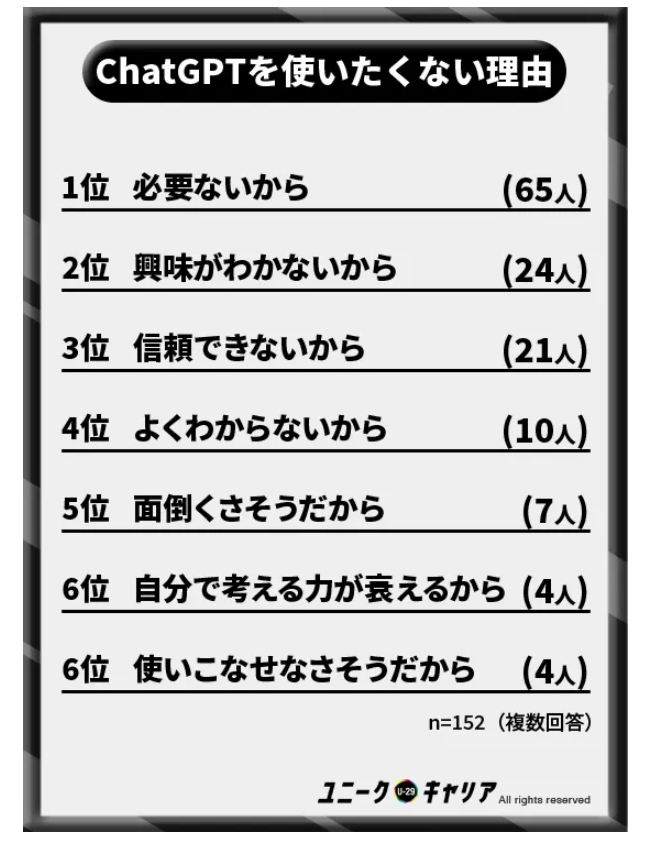 ある調査では、「ChatGPTを使いたくない理由」に対して「よくわからないから」「使いこなせなさそうだから」という回答が寄せられており、利用に対する難しさを感じている方が少なくないと考えられます。また、最多回答の「必要ないから」についても、具体的な利用イメージがわかない・必要性や利用可能性に気づけていない方が含まれていることが見込まれます。