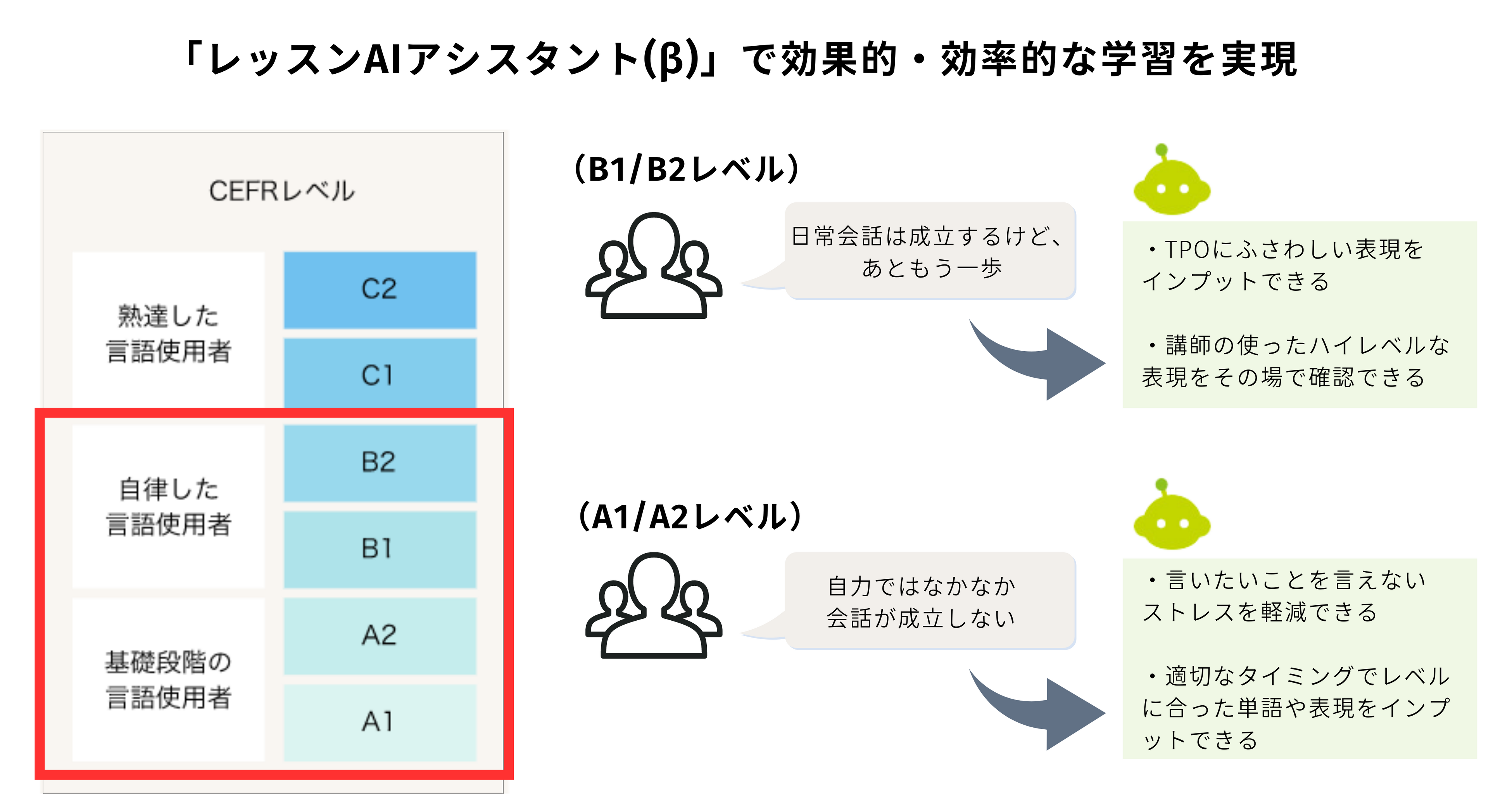 第二言語習得理論の観点においても、レッスン中のAI活用は学習効果に貢献すると考えられます。英会話力の習熟度(国際的な言語基準のCEFRレベル)によって、見込める学習効果は下記の通りです。