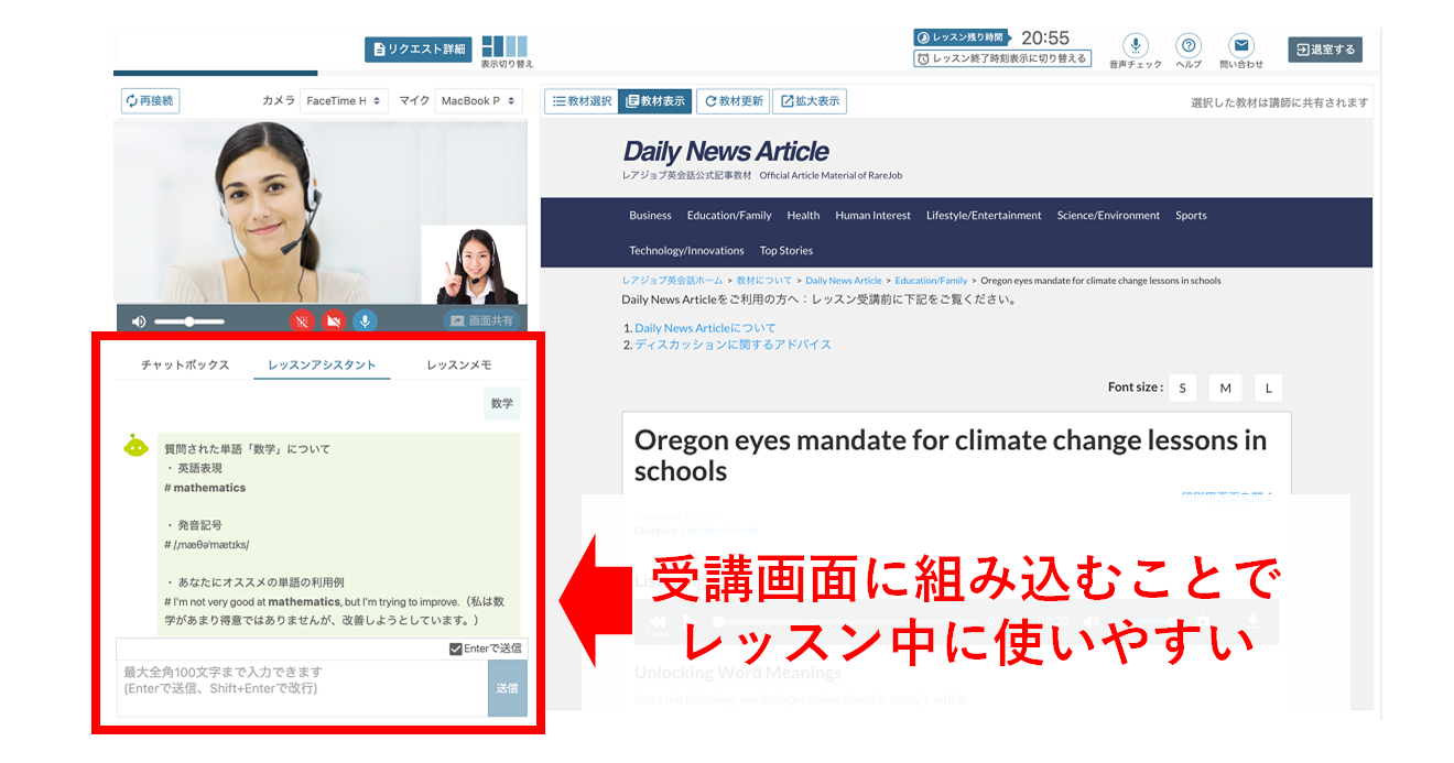 今回「レアジョブ英会話」に新たにリリースした「レッスンAIアシスタント(β)」は、英会話レッスンの最中という利用シーンに特化した機能です。