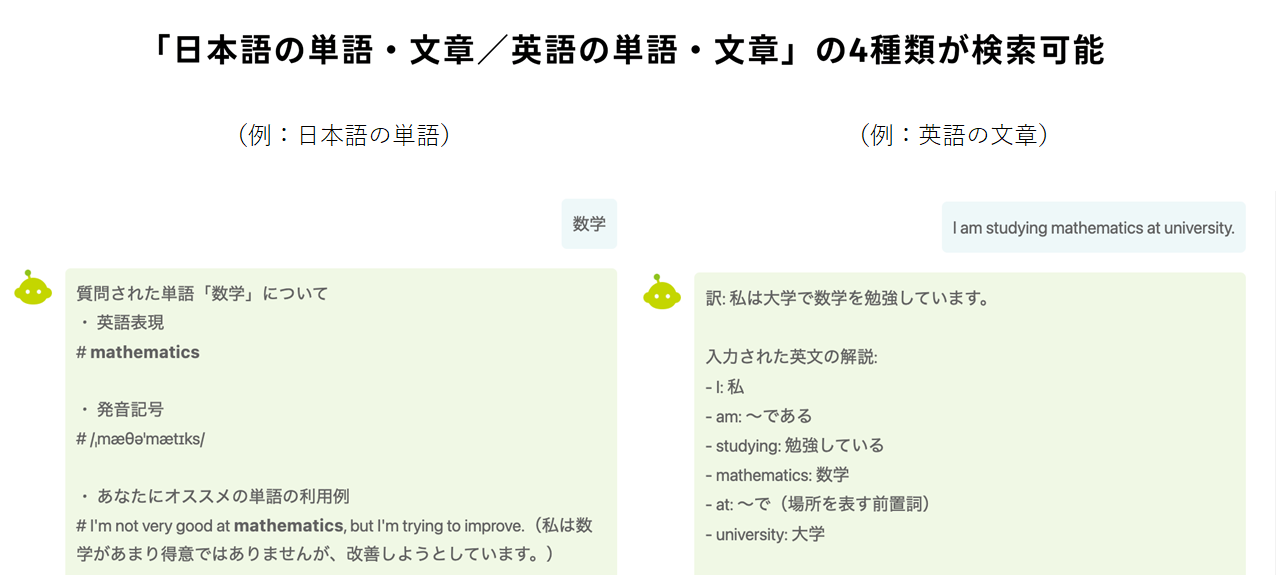 レッスン画面に組み込まれたテキストボックスに英語・日本語の単語や文章を打ち込むだけで、翻訳や推奨表現などを表示。講師との実践的な対話の流れを止めることなくスムーズな英会話レッスンに役立てられます。機能を絞っているので、レッスンに必要ではない情報が長々と表示されることもありません。ChatGPTの使い方に対する不安を払しょくすると同時に、より効果的かつ効率的な英語学習体験を受講者に提供できるようになりました。