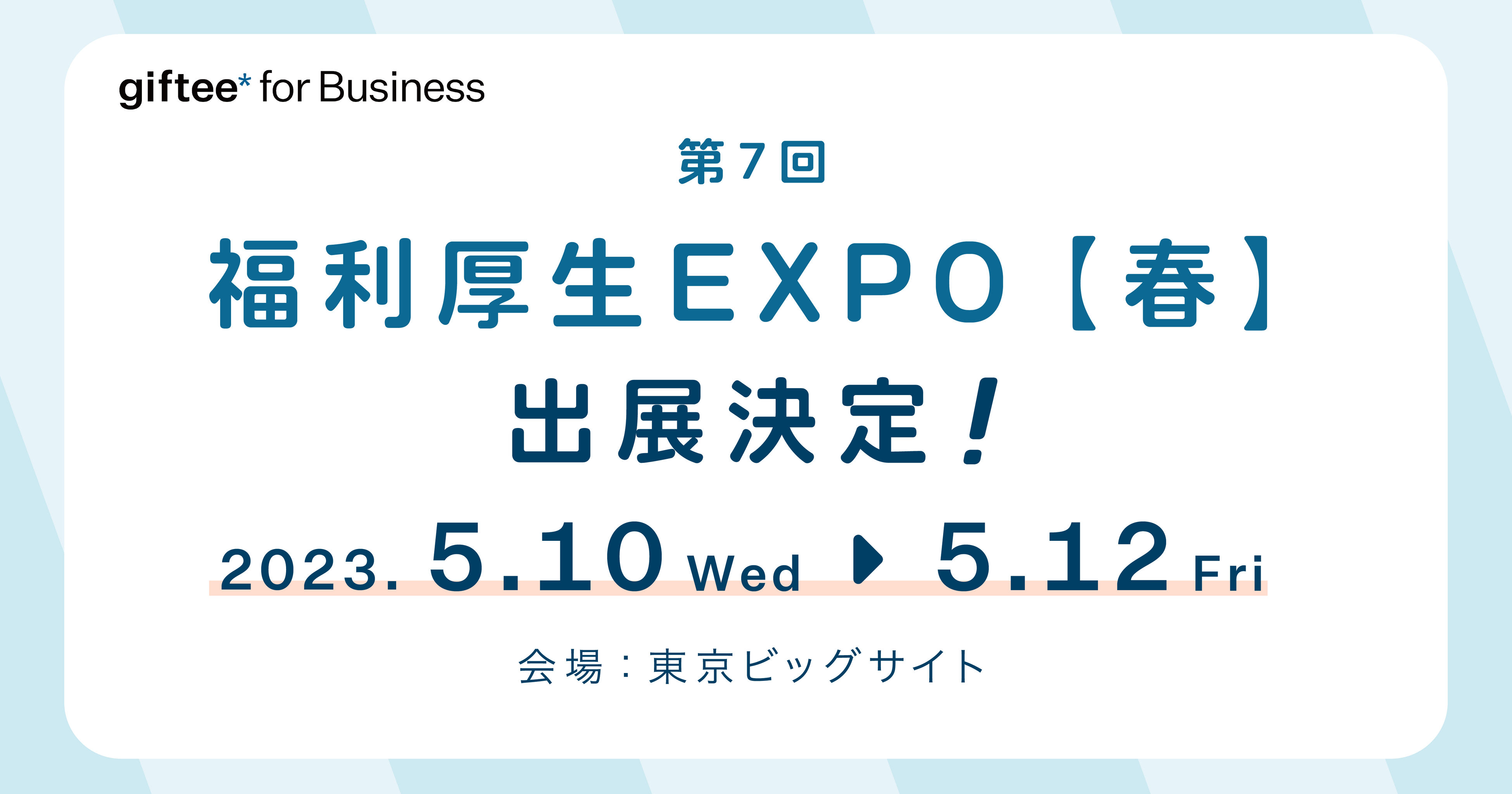 eギフトプラットフォーム事業(※1)を展開する株式会社ギフティ(本社:東京都品川区/代表取締役:太田 睦、鈴木 達哉/以下、ギフティ)は、デジタルギフトを活用した法人向けサービス「giftee for Business」を、2023年5月10日(水)〜12日(金)の期間、東京ビッグサイトで開催される福利厚生に特化した専門展示会「第7回福利厚生EXPO【春】」(主催:RX Japan株式会社)にブース出展することをお知らせいたします。