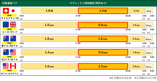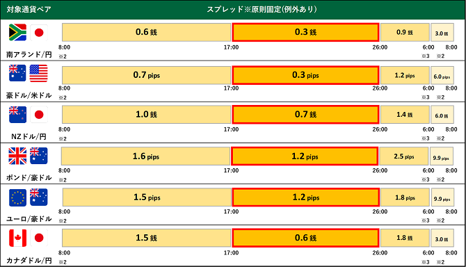 ※1.主要経済指標発表時等の急変時、国内外の休日や平日早朝など著しい流動性低下時はやむをえずスプレッドを拡大する場合がございます。 メンテナンス時間(火曜日~金曜日 各日5:55~6:10、土曜日5:50~月曜日7:00)は適用時間に含まれません。