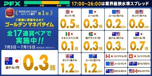 概要:パートナーズFXにおいて、17:00~26:00(ゴールデン マネパタイム)の時間帯は「豪ドル/円0.3銭」、「ユーロ/米ドル0.2pips」をはじめ、全17通貨ペアでスプレッドを縮小し、業界最狭水準スプレッドを提示いたします。原則固定 (例外あり)