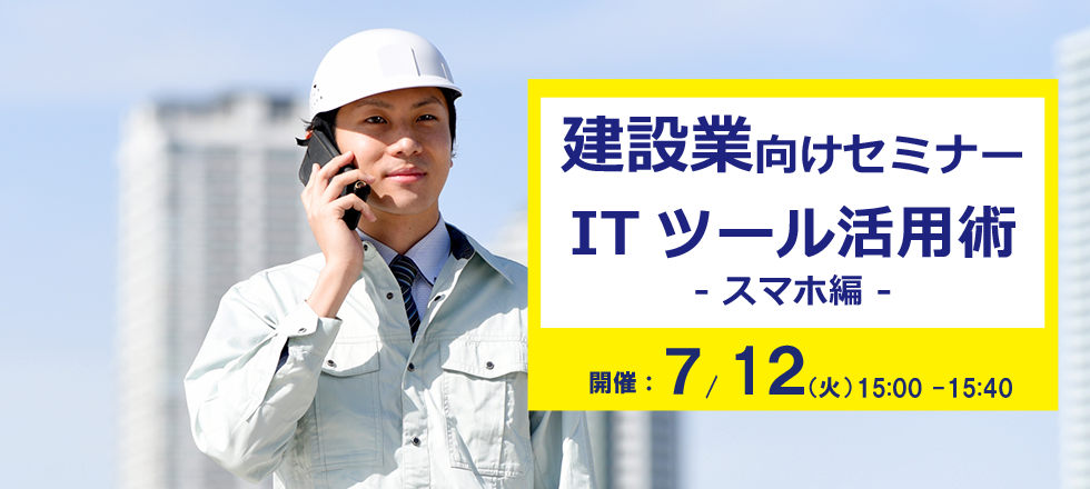 本セミナーでは、最も身近なITツールである「スマートフォン」にスポットを当て、建設現場の業務効率アップ・コスト削減につながる活用方法をご紹介します。