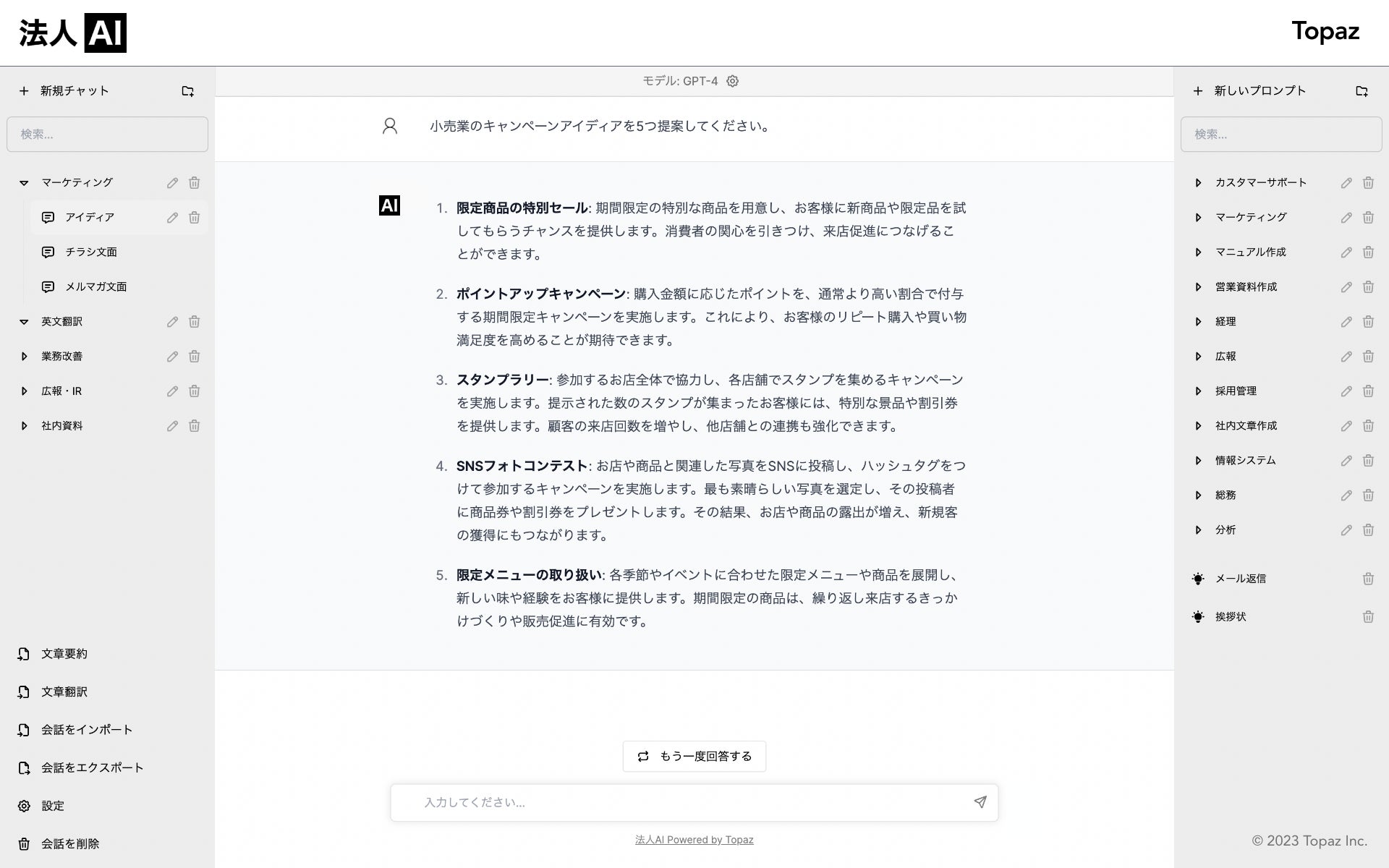 2000社導入のAIプラットフォーム「AIOne」を提供するTopaz合同会社(本社: 千葉県佐倉市、代表: 菅野将斗)は、GPT-4が利用可能な法人向け生成AI・AIチャットサービス「法人AI」を一般リリースいたします。なお、法人AIは一部の企業様に先行提供しており、AIOneと合わせて2000社以上の導入実績を誇ります。