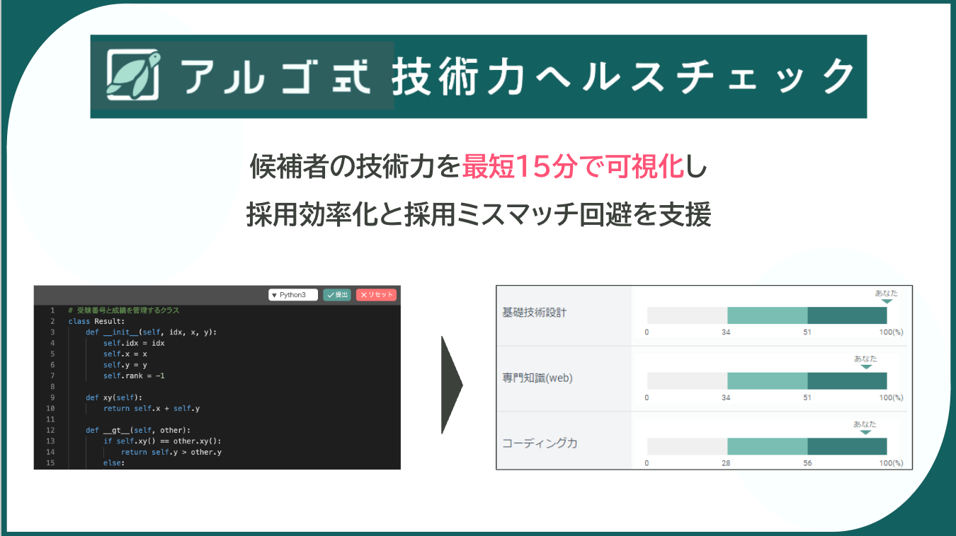 そこで、今回アルゴ式が提供を開始した「技術力ヘルスチェック」では、日本の採用市場に沿った測定・評価手法を用いることで、技術力ミスマッチの防止を支援いたします。