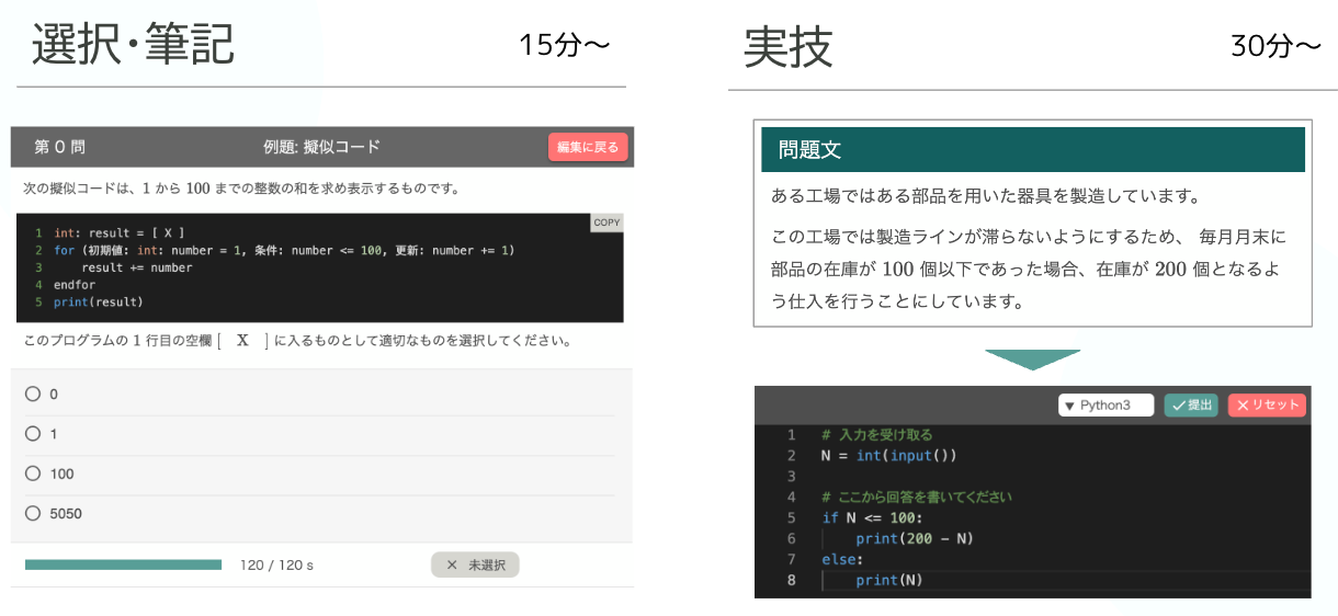 オンライン上で完結した「選択・筆記」と「実技」からなる2つの形のテストを通して、候補者の技術力を測定し、最短15分でレポーティングまでを行います。