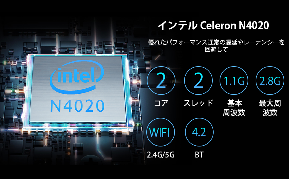 B2 S は Windows 11 Proです。Celeron N4020プロセッサーを搭載し、エンターテインメント、AD、オフィス、教育業界など、さまざまなシーンに適しています。Celeron N4020 、1.1GHz〜2.8GHzの周波数を使用しています。2コア2スレッド、14nmの先進技術、高速Wi-Fi 2.4GHz/5GHz、Bluetooth 4.2、4K@60Hz、コンピューターをスムーズに実行できます。6GB+128GBのメモリをフル増設可能。最大2TBまで拡張可能。