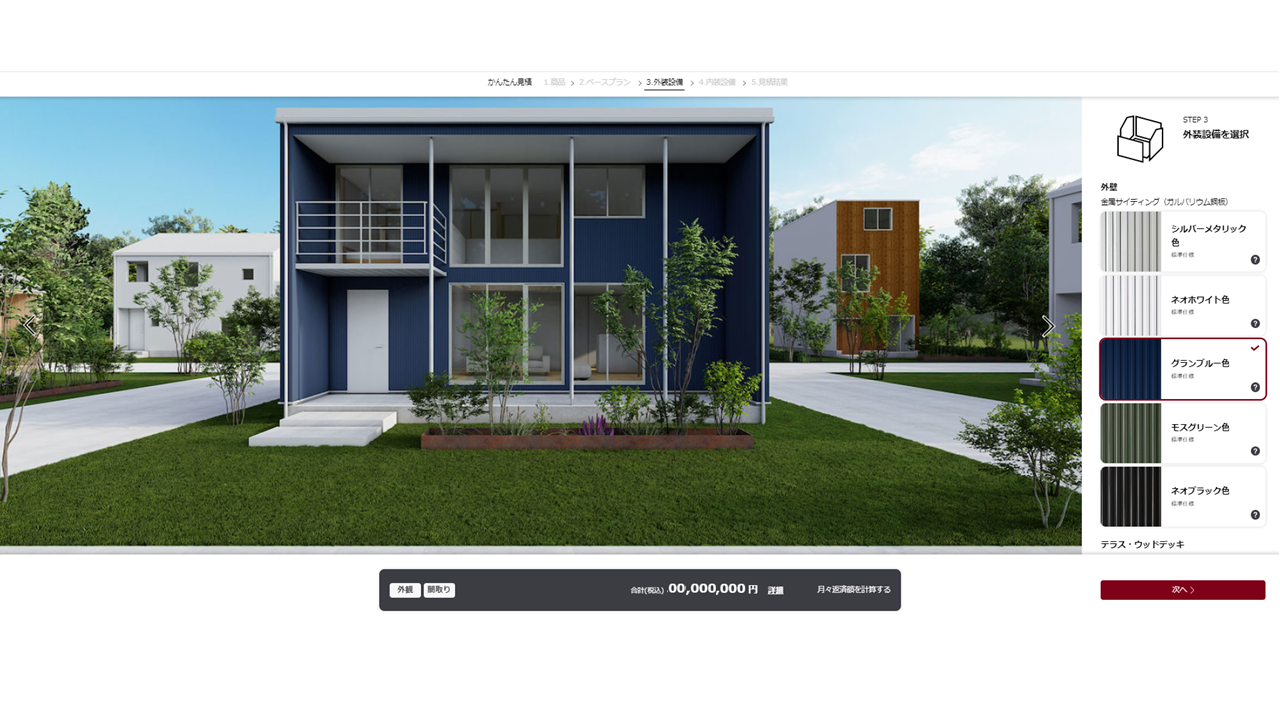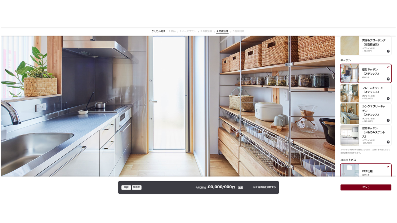 選択した項目の概算見積(建物本体工事の価格)が表示されます。建物本体工事の概算金額がわかるだけでなく、簡易ローンシミュレーションも実施いただけます。土地代などの概算金額も入力できるため、月々の返済額のイメージを実際に持っていただくことができます。