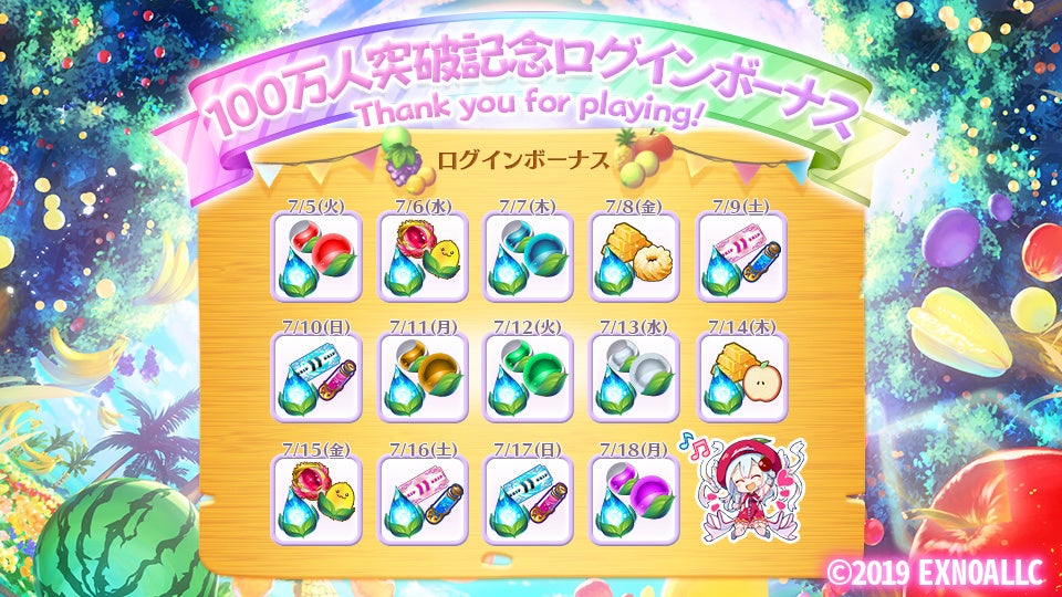 皆様の日頃のご愛顧と、登録者数100万人突破を記念して、毎日ログインすることで合計2500個の創生石の他、育成アイテムやゴールド、体力回復薬などゲームプレイを手助けする様々なアイテムがもらえる特別なログインボーナスを実施中!