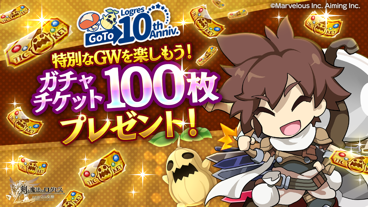 GWの特別プレゼントとして、ゴールデンガチャチケット100枚を期間中の初回ログイン時にお贈りします。