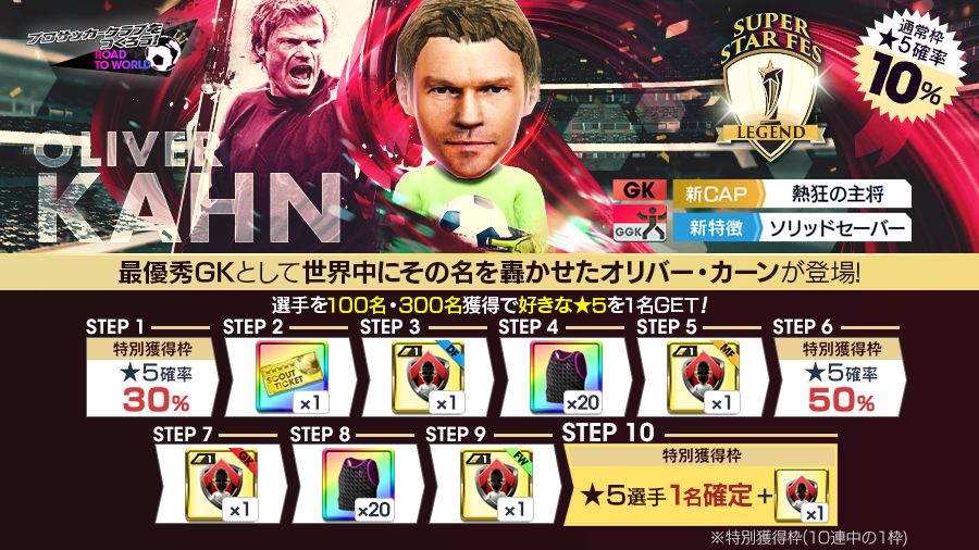 レジェンド「オリバー・カーン」や現役選手など、世界のスーパースターたちが新★5選手として登場する特典付きの特別なスカウトです。