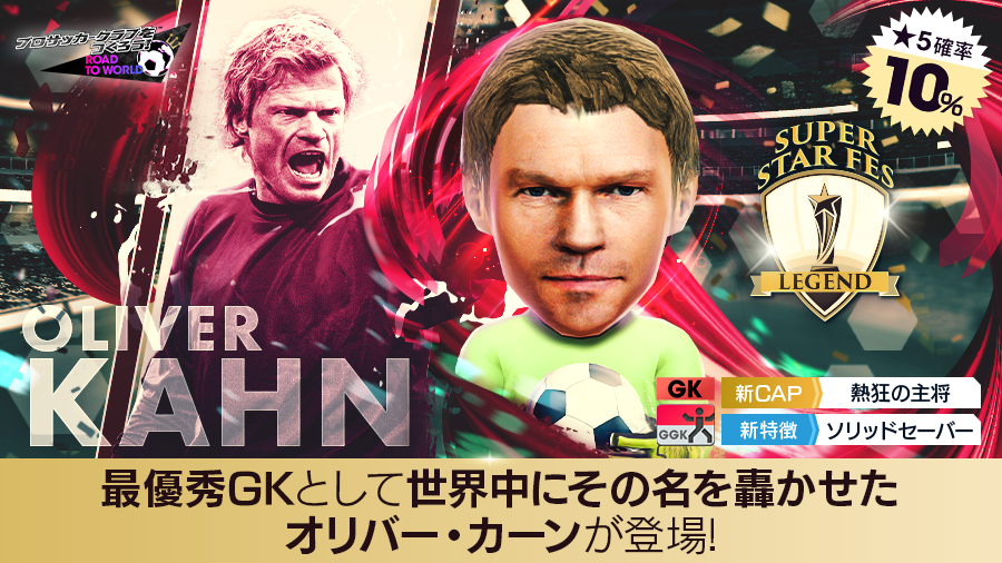 レジェンド「オリバー・カーン」をはじめ、世界のスーパースターたちが得意戦術「中央突破」の新★5選手として登場する“SUPER STAR FES LEGEND”を開催!