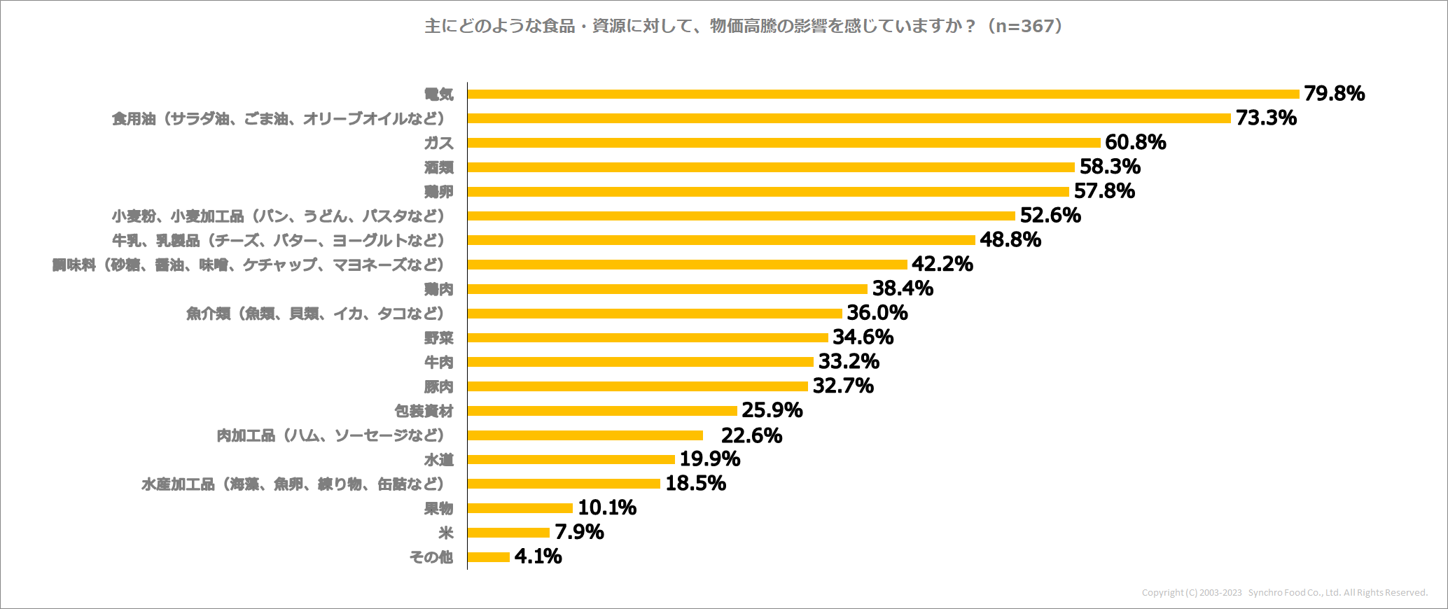 さらに、物価高騰の影響を「実感している」と回答した方に、主にどのような食品・資源に物価高騰の影響を感じているか尋ねたところ、上位となったのは「電気(79.8%)」、「食用油(73.3%)」、「ガス(60.8%)」で、業態を問わず飲食店に必要な物資が並ぶ結果となりました。続く、「酒類(58.3%)」、「鶏卵(57.8%)」、「小麦粉、小麦加工品(52.6%)」も5割を超え、価格高騰の対象となる品目がいかに多いかを改めて示しました。