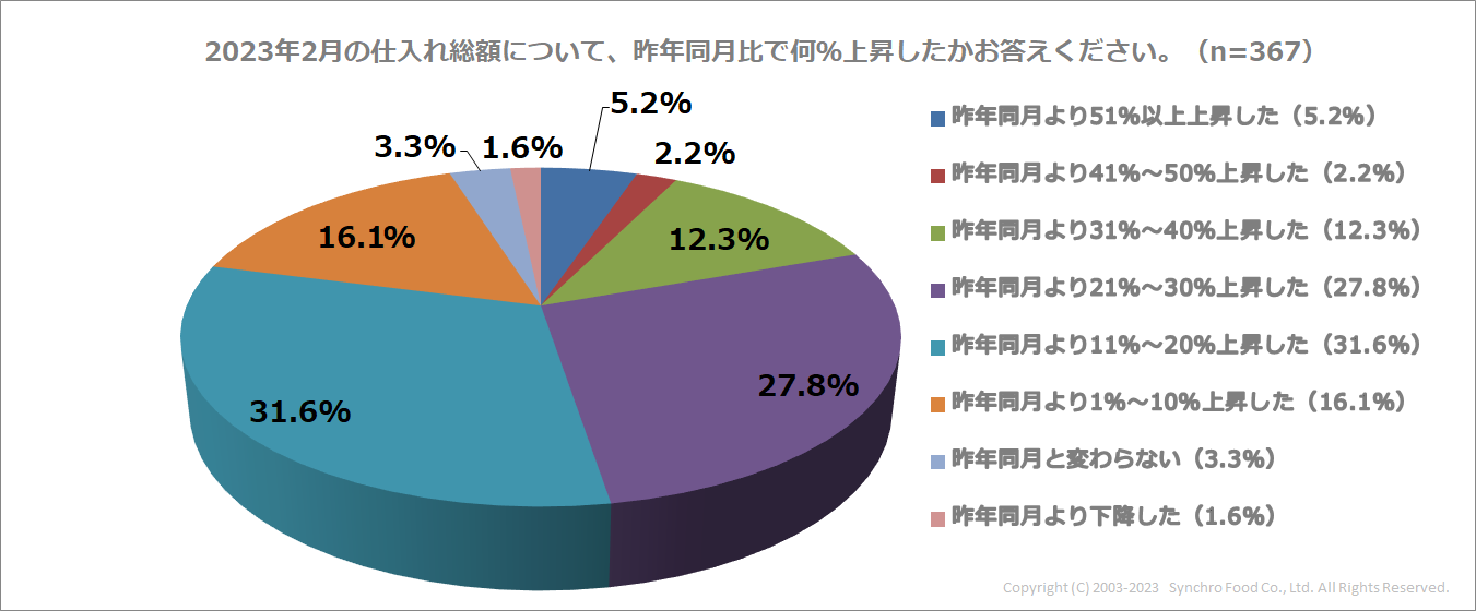 全体をみると、「昨年同月と変わらない(3.3%)」、「昨年同月より下降した(1.6%)」との回答はわずか4.9%でした。対して「昨年同月より上昇した」と回答した店舗は95.2%で、ほとんどの店舗で仕入れ総額が増えていることがわかります。