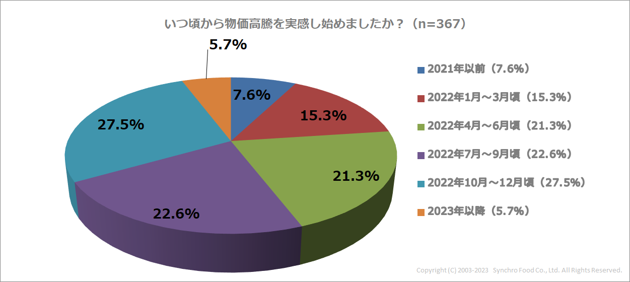 続いて、物価高騰の影響を「実感している」(とても実感している、やや実感している)と回答した方に、いつ頃から物価高騰を実感し始めたか答えてもらったところ、最も多かったのは「2022年10月~12月頃(27.5%)」との回答。次いで、「2022年7月~9月頃(22.6%)」、「2022年4月~6月頃(21.3%)」と続きました。2022年は40年ぶりの高い物価上昇がみられた一年であり、実感を得た人も多かったようです。