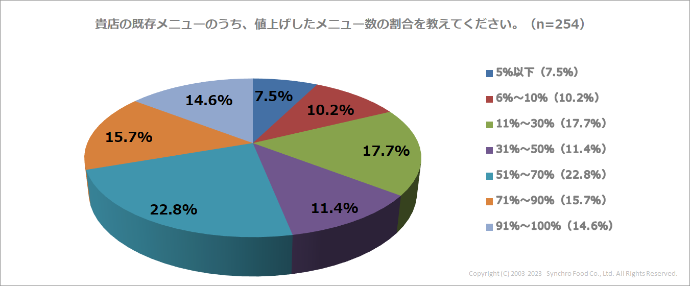 また、「既存メニューの値上げ」に取り組んでいる店舗に、値上げしたメニューの割合を尋ねたところ、最も多かったのが、「51%~70%(22.8%)」との回答でした。「71%~90%(15.7%)」、「91%~100%(14.6%)」との回答と合わせると、53.1%の店舗がメニューの半分以上を値上げしています。