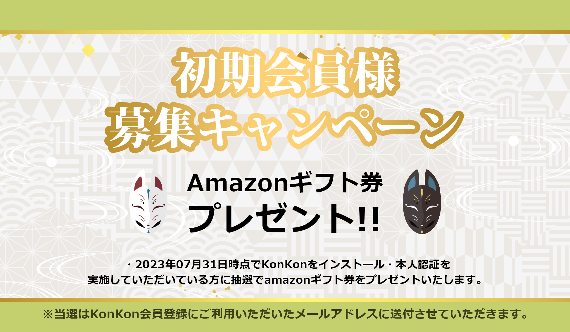 ・2023年07月31日時点でKonKonをインストール・本人認証までを実施していただいている方に抽選でamazonギフト券をプレゼントいたします。