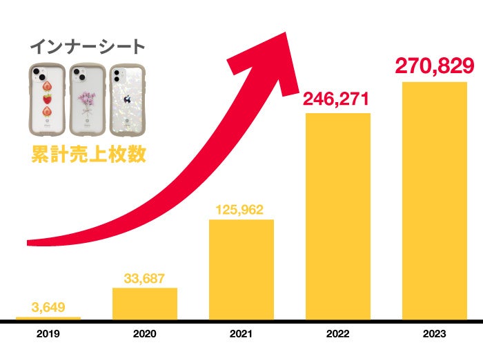 昨今、若者を中心にクリアのスマホケースにインナーシートや写真などを挟んでアレンジすることが流行っています。iFaceのインナーシートもその流行に乗り、2021年から2022年の2年間で20万枚以上を販売し、累計集荷25万枚を突破しました。