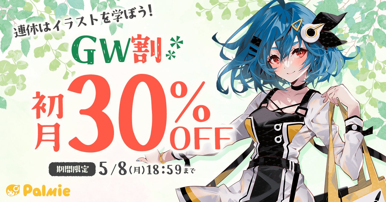株式会社パルミー(所在地:東京都港区、代表取締役:伊藤貴広、以下パルミー)は、本日4月27日(木)12時00分〜5月8日(月)18時59分までの期間、初月受講料が30%OFFになる「GW割」を開催いたします。また、同期間に「Amazonギフト券最大5,000円分プレゼント!学生応援キャンペーン」も開催いたします。ゴールデンウィークはパルミーでイラストを学んでみませんか?