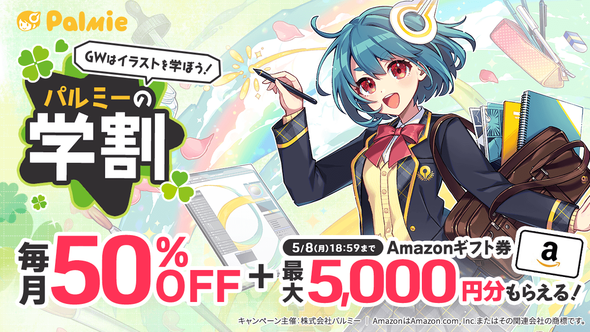株式会社パルミー(所在地:東京都港区、代表取締役:伊藤貴広、以下パルミー)は、本日4月27日(木)12時00分〜5月8日(月)18時59分までの期間、初月受講料が30%OFFになる「GW割」を開催いたします。また、同期間に「Amazonギフト券最大5,000円分プレゼント!学生応援キャンペーン」も開催いたします。ゴールデンウィークはパルミーでイラストを学んでみませんか?