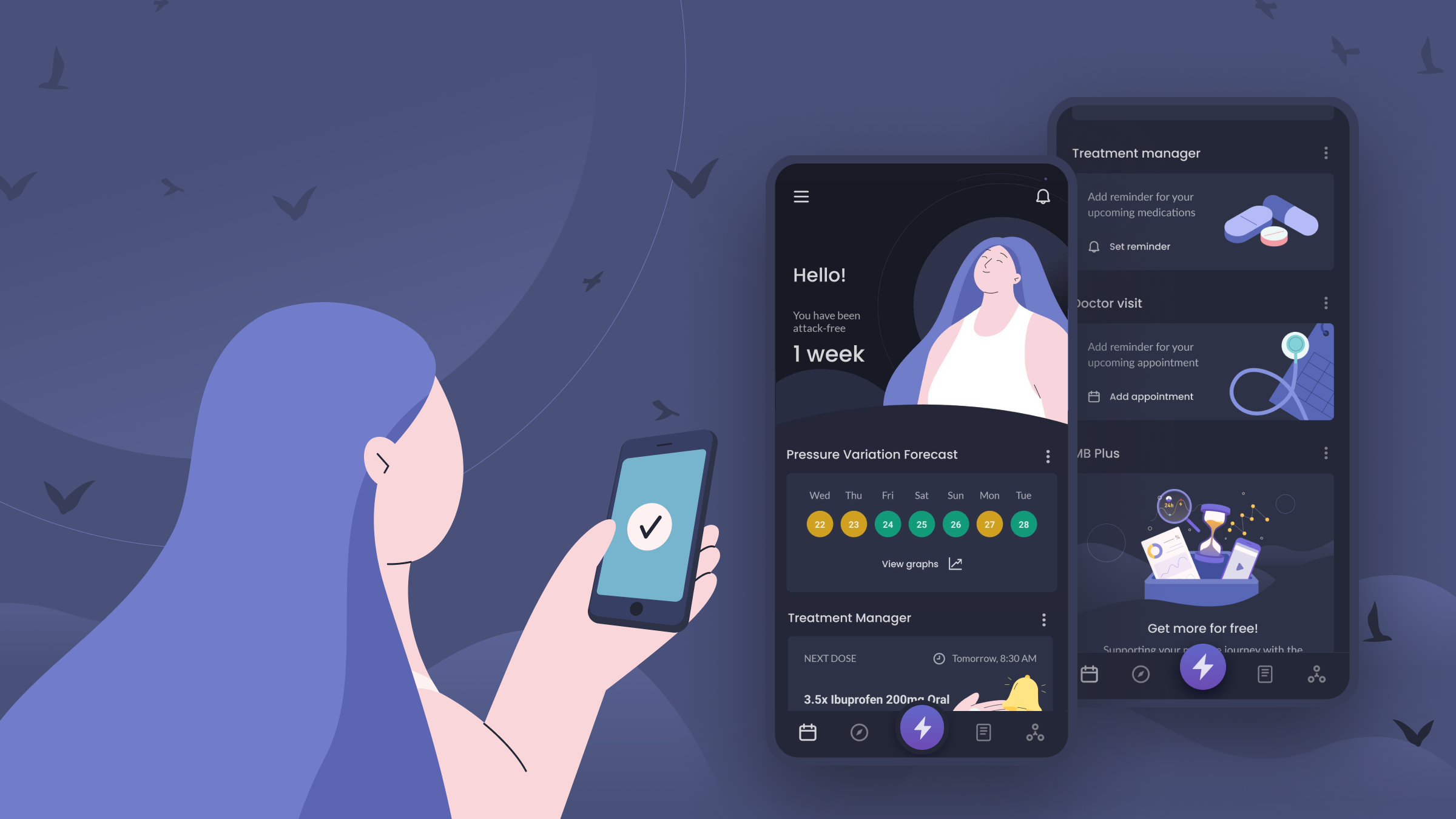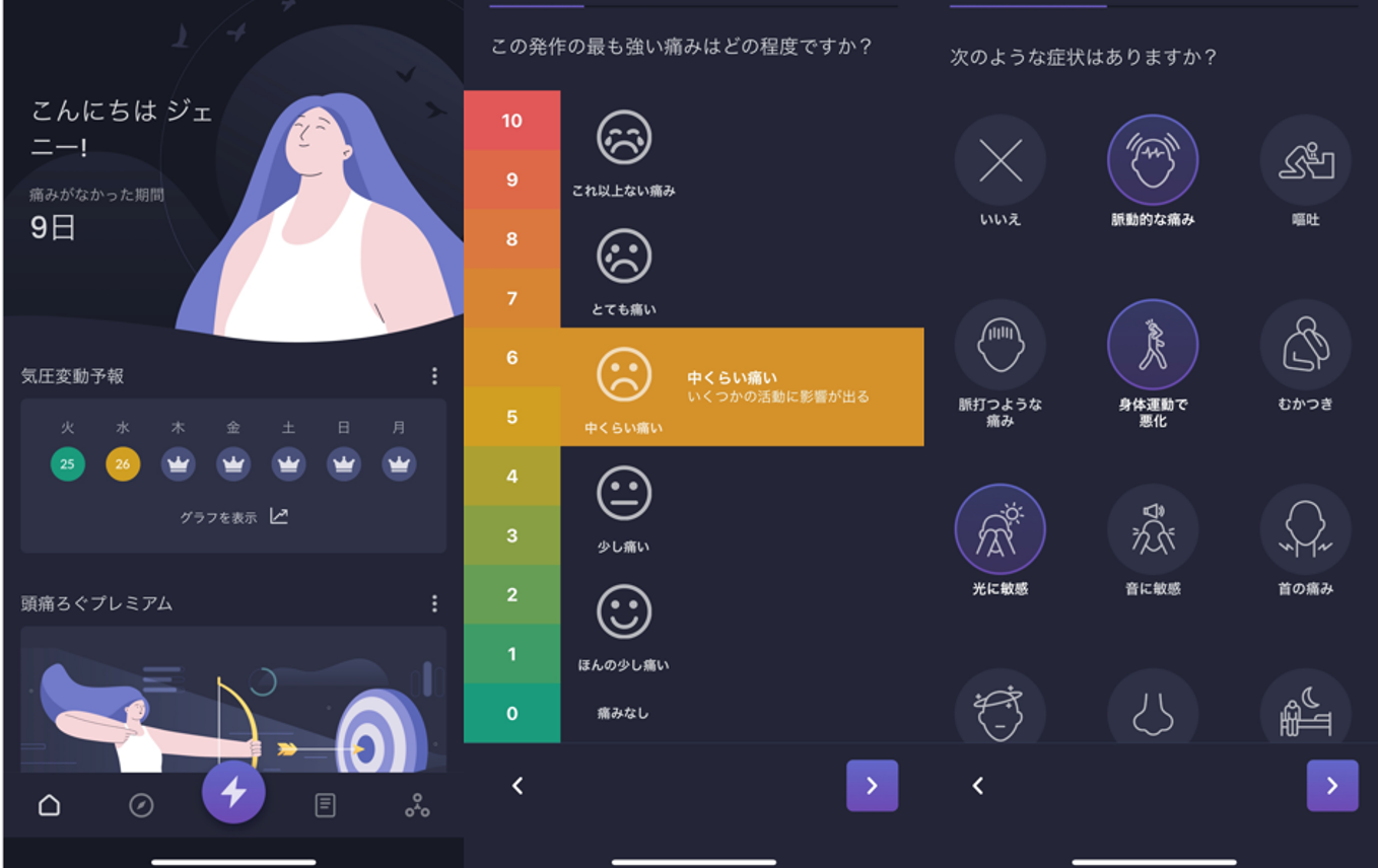 ヒーリントが提供する頭痛記録アプリである「頭痛ろぐ」(英語名Migraine Buddy) のユーザー数は、海外と日本を合わせて330万人以上です。頭痛ろぐは、無料で使用することができるアプリですが、有料のプレミアム会員になれば、ユーザーの頭痛記録に基づくテイラーメイドの気象と誘因の2種類の月次分析レポートを受領したり、気象データをより詳細に見たりすることができるようになっています。