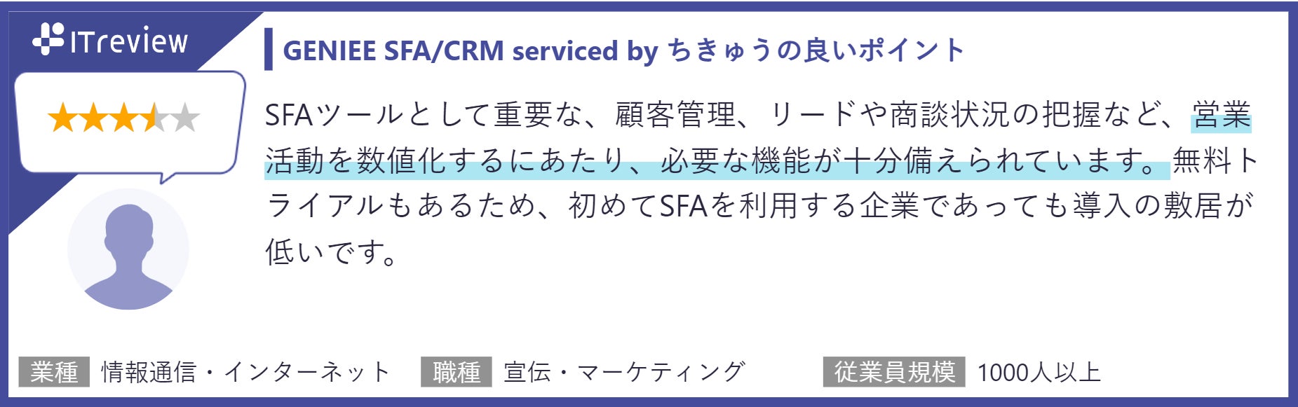 今回は、当社の営業管理ツール「GENIEE SFA/CRM」がITreview Grid Award 2023 Springにおいて顧客満足度の優れた製品に贈られる「High Performer」をSFA部門、CRM部門の2部門にて受賞することができました。2022年3月までに掲載されたレビューの集計結果をもとに選ばれ、使いやすさや費用対効果の高さに対する好評価のコメントが多く寄せられました。