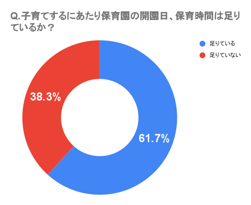 保育園児の親に「子育てをするにあたって保育園の開園日や開園時間は十分に足りているか」を質問したところ、約6割は「十分に足りている」と回答した一方、38.3%が「十分には足りていない」と回答しました。