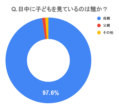 保育園に通っていない場合、日中に子どもの面倒を見ているのは97.6%が母親でした。無園児は、母親が定期的な仕事についていないために保育園に通っていないケースの他に、母親が産休や育休中である場合も含まれています。いずれにしても、日中に子の面倒を母親が見ているケースが大半であり、母親に育児負担が偏っていることがわかります。