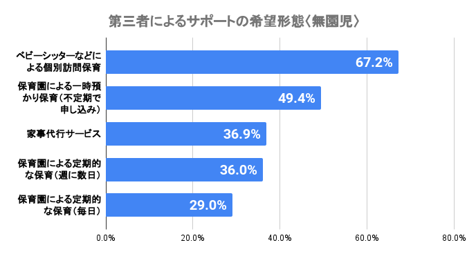 無園児の親が望む第三者のサポート形態は、保育園児の親と同じく「ベビーシッターなどによる個別訪問保育」が67.2%と一位になりました。